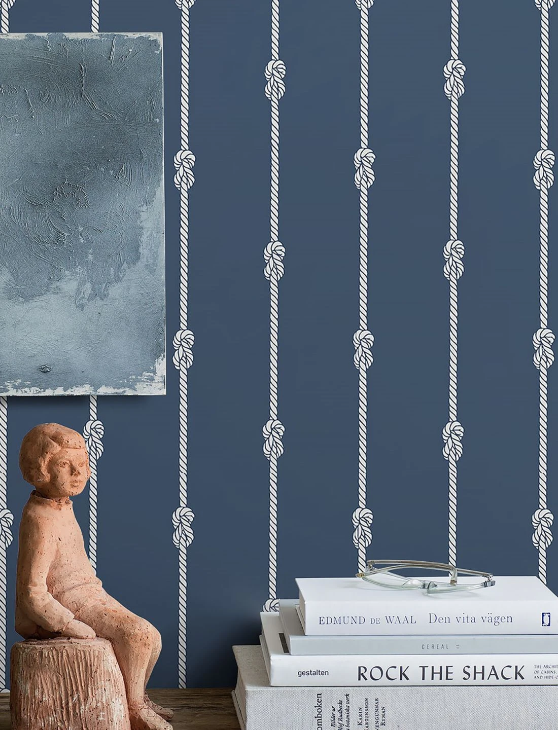 Streifen mal anders und in einer weich fließenden Bewegung, die das Auge sofort mitnimmt. Die Seile mit weichen Knoten wirken aus der Entfernung betrachtet wie barocke Kordeln. Das Muster der glatten, waschbeständigen Vliestapete verströmt feine Eleganz, die durch den Kontrast von Weiss und Dunkelblau zusätzlich vertieft wird.