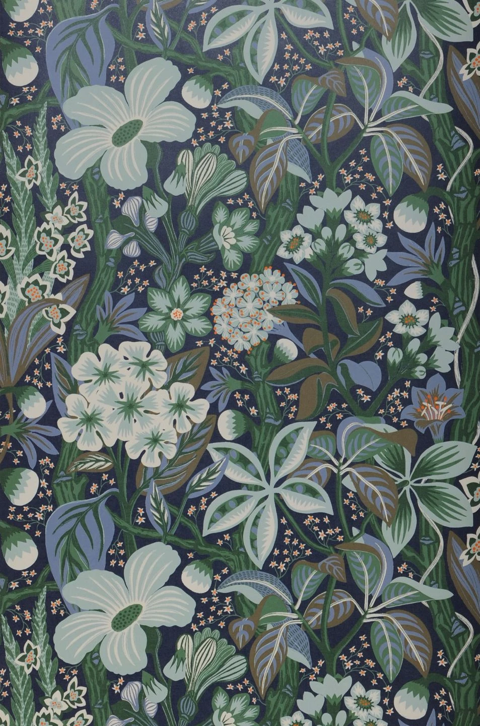 Die Auswahl von Grün- und Blautönen und Weiß gibt der schier überbordenden Fülle und Vielfalt unterschiedlich geformter Blumen und Blätter einen inneren Zusammenhalt und erzeugt eine perfekte Synthese aus Ruhe und Lebendigkeit. Details in kräftigem Orange heben sich in wohlkalkuliertem Kontrast von den ruhigen Blattfarben ab. Fanfara bildet einen wunderschönen Gegenpart zu weißen Möbeln und lässt sich attraktiv mit einer passenden Wandfarbe kombinieren.
