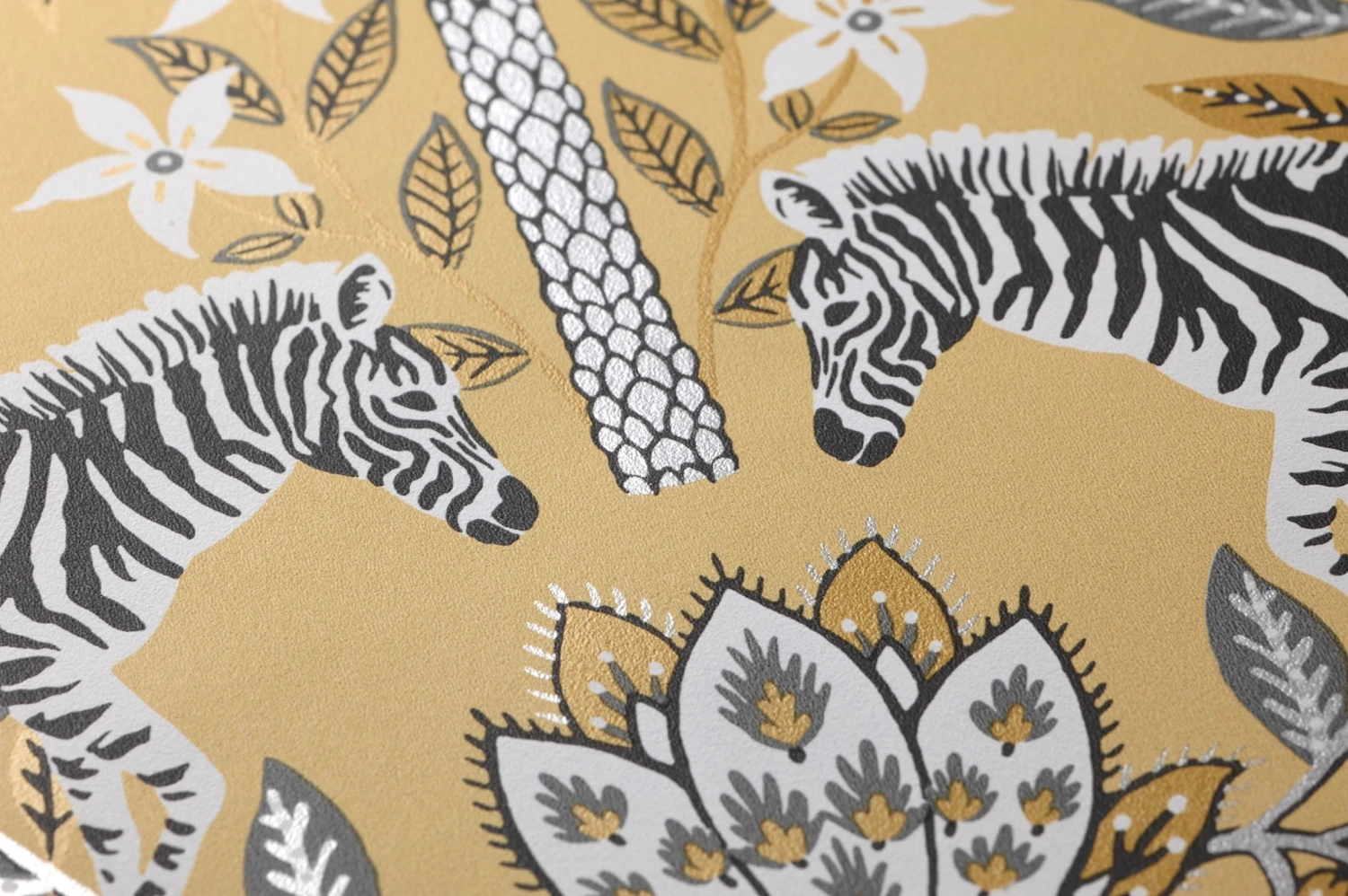 Stilisierte exotische Elemente charakterisieren diese Vliestapete. Zwischen Palmen, raffiniert geformten und gemusterten Blüten und Ranken finden sich junge Zebras. Der hellgelbe Hintergrund liefert eine heitere, sonnige Atmosphäre. Liebevoll mit Gold- und Silberfarbe betonte Ornamente sorgen für schimmernde Lichtreflexe. Die symmetrische Anordnung der Elemente schafft ein ordnendes Prinzip inmitten der Fülle von Details.