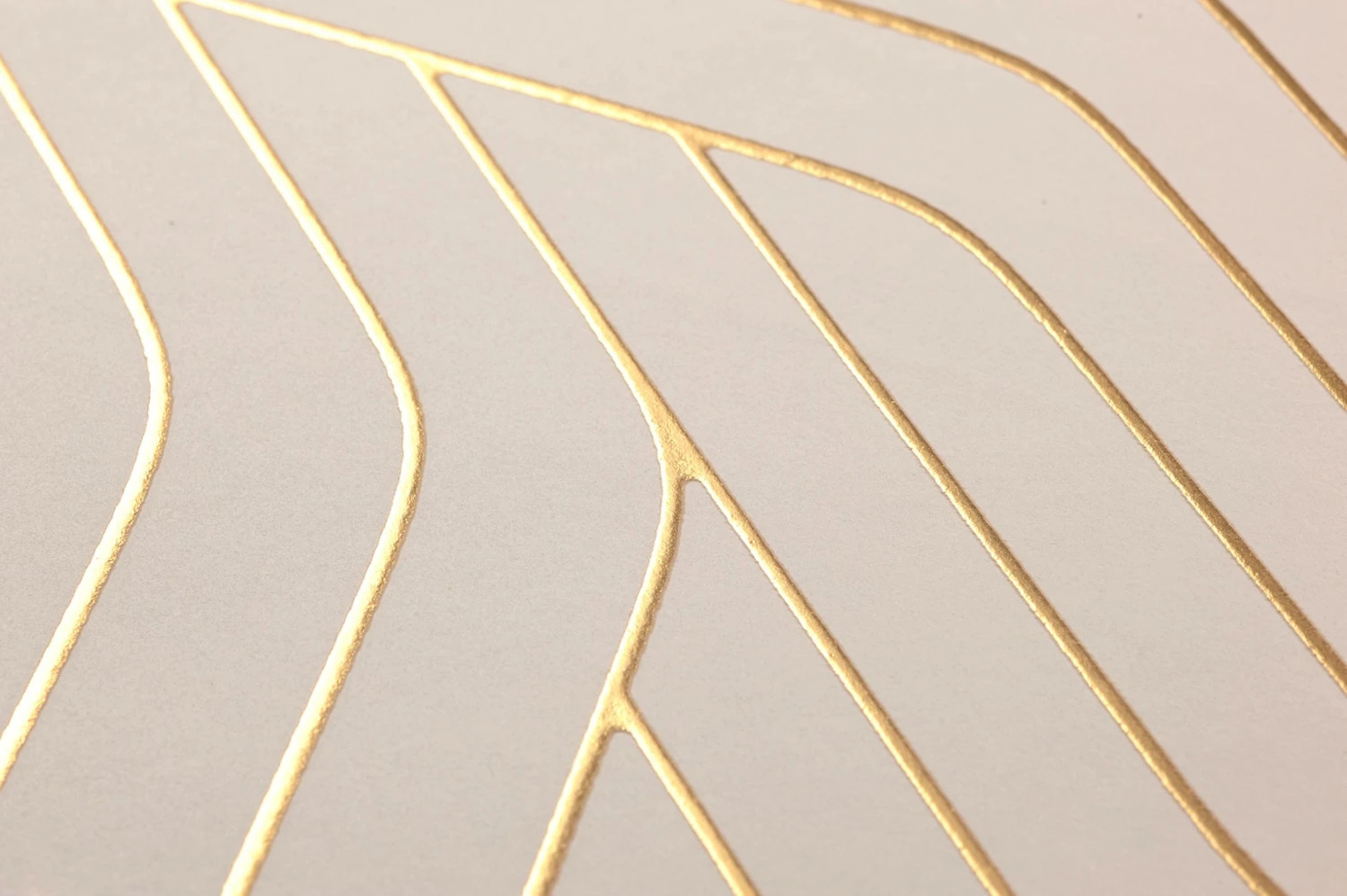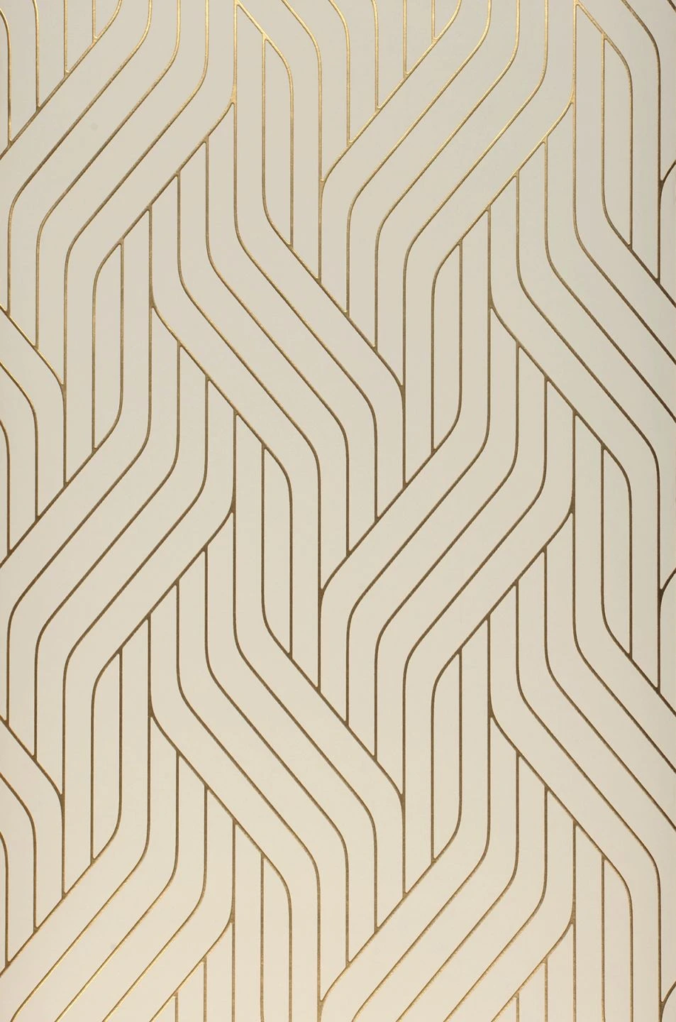 Dezenten Luxus strahlt diese Vliestapete im Art-Deco-Stil aus. Golden glänzende, erhabene Linien bilden eine fühlbare feine Struktur und finden sich zu einem schlichten Muster zusammen. Der Verlauf der Ornamente lässt die Illusion von Stufen entstehen, die einen Eindruck von räumlicher Tiefe erzeugen. Hell und festlich wirken die goldenen grafischen Elemente auf dem schlicht cremeweißen Hintergrund.