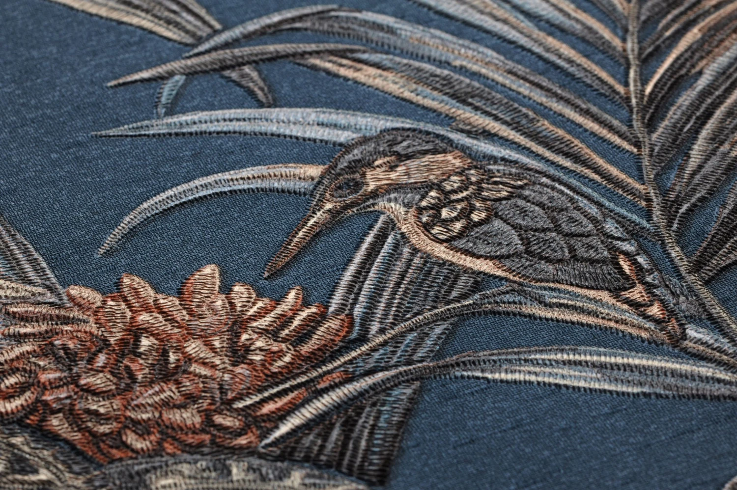 An eine handgearbeitete Stickerei auf gewebtem Untergrund erinnert die elegante Vliestapete Flonie mit ihrer feinen, in das Vinyl der Oberfläche geprägten Struktur. Die abgebildeten exotischen Vögel, Blätter und Blüten in den sanften Grau-, Blau- und Orangebrauntönen heben sich so noch mehr vom grünblauen Grund ab. Zudem ist die Oberfläche hoch waschbeständig und dadurch auch für Ihr Bad bestens geeignet.