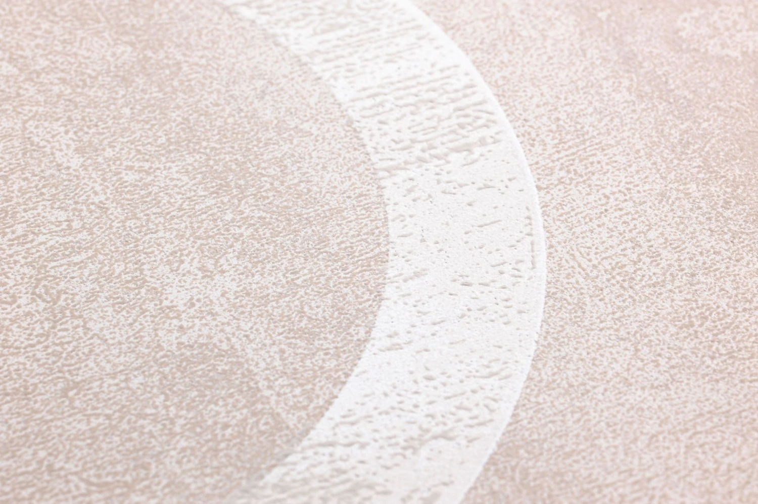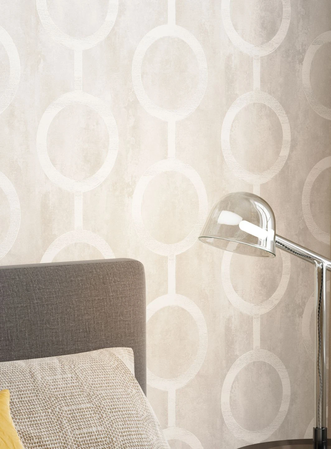 Verschiedene Weiß- und Hellgrautöne suggerieren durch die besondere Drucktechnik eine schimmernde bewegte Struktur des großformatigen Kreismusters. Die hochwertige Vliestapete eignet sich für den Retro-Look ebenso wie für moderne plakative Gestaltungen. Das Spiel mit Licht und Schatten macht sie auch für Chill-Out-Räume hoch interessant.