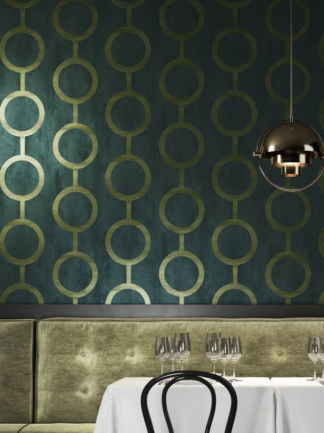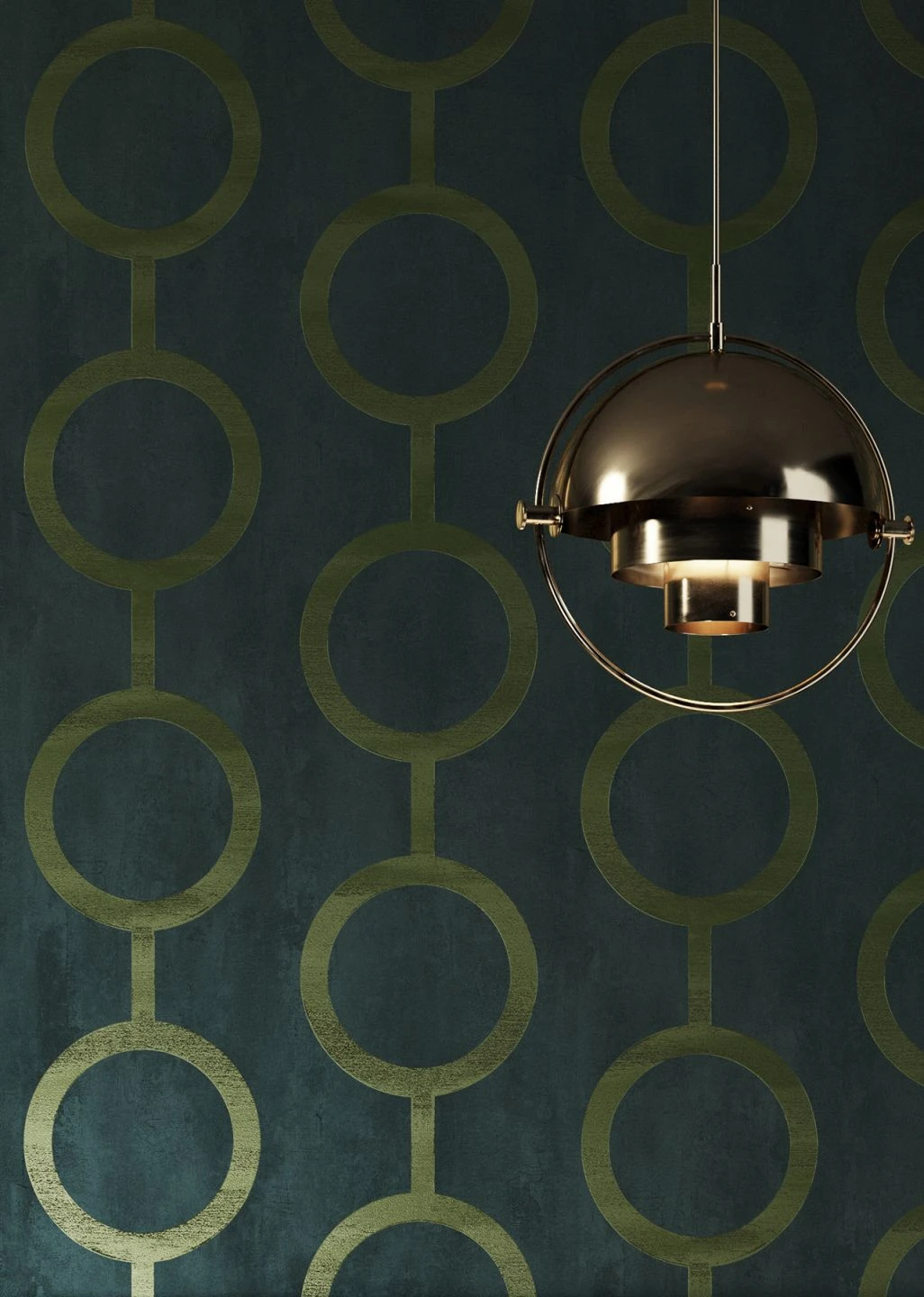 Hell-Dunkel, Licht und Schatten, Schimmer und Matt – Ein wahrere Zauberkünstler ist Geometrie Tapete Florin, die in der mystischen Farbkombination aus Schilfgrün, Tannengrün, Kieferngrün und Schwarzgrün eine tiefgründige Ausstrahlung erhält. Ein prächtiges Gestaltungselement für das private Speisezimmer, die gehobene Gastronomie oder eine Bohemian-Lounge.
