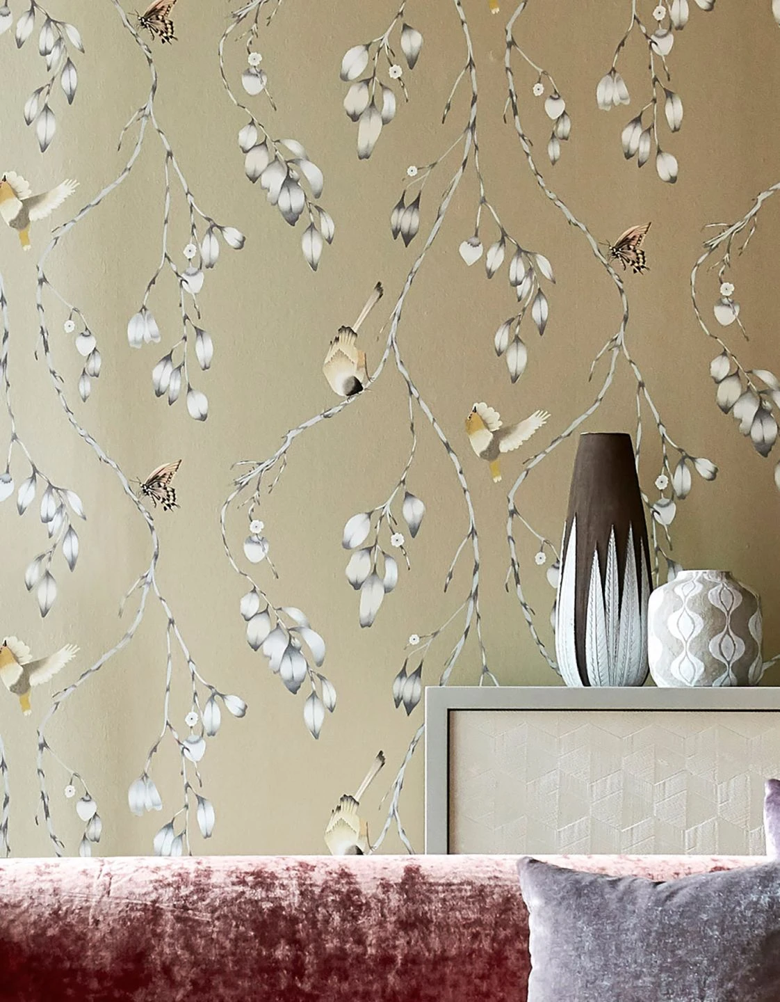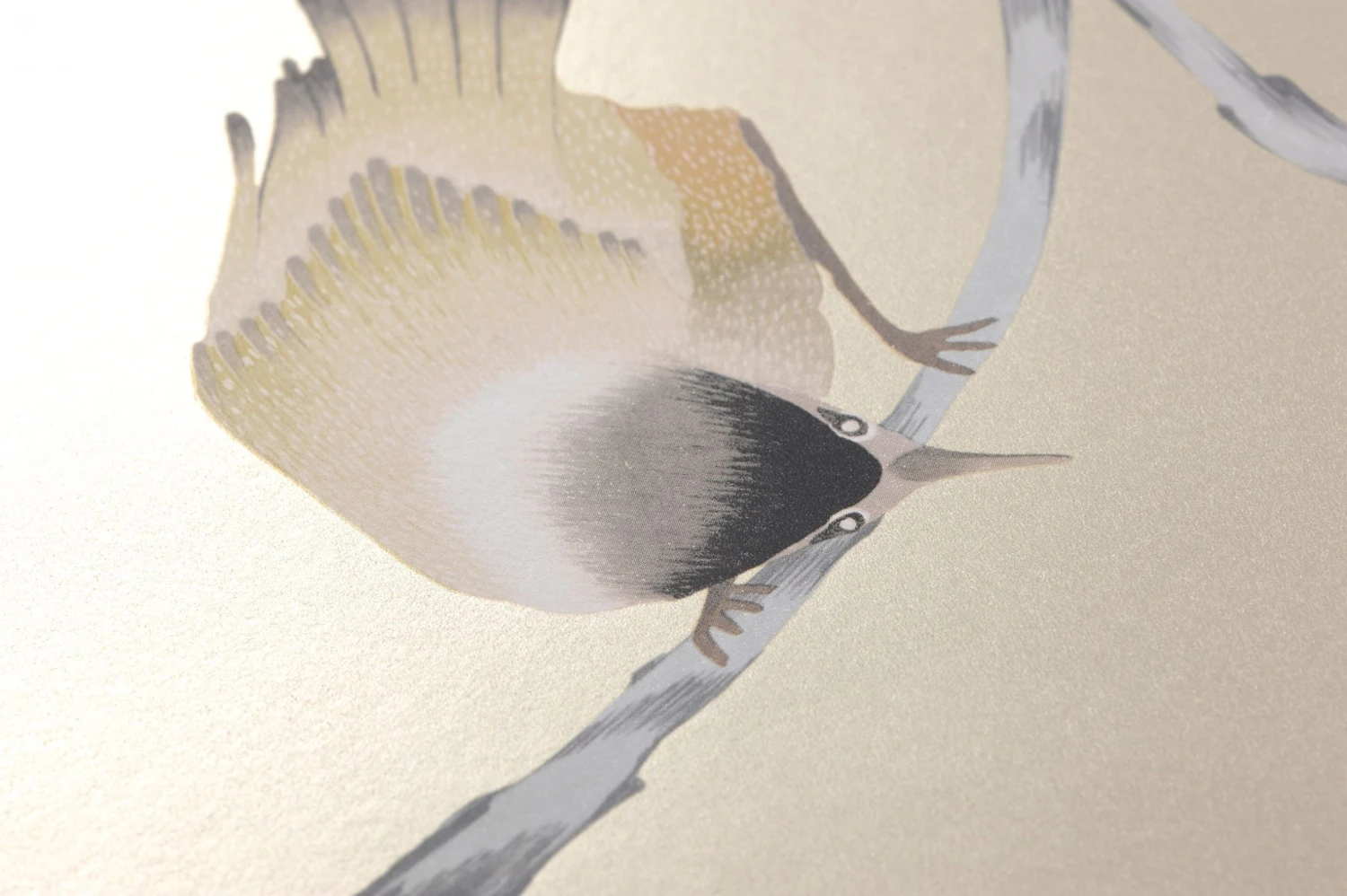 Sich nach unten schlängelnde Zweige mit feinen Blüten bilden den Tummelplatz für eine aktive Vogelschar. Die Romantik Tapete präsentiert sich in den weichen Musterfarben Beige, Cremeweiss, Grau, Graubeige, Hellrosa. Perlbeige als schimmernde Grundfarbe verleiht der glatten Vliestapete den extravaganten glamourösen Touch.