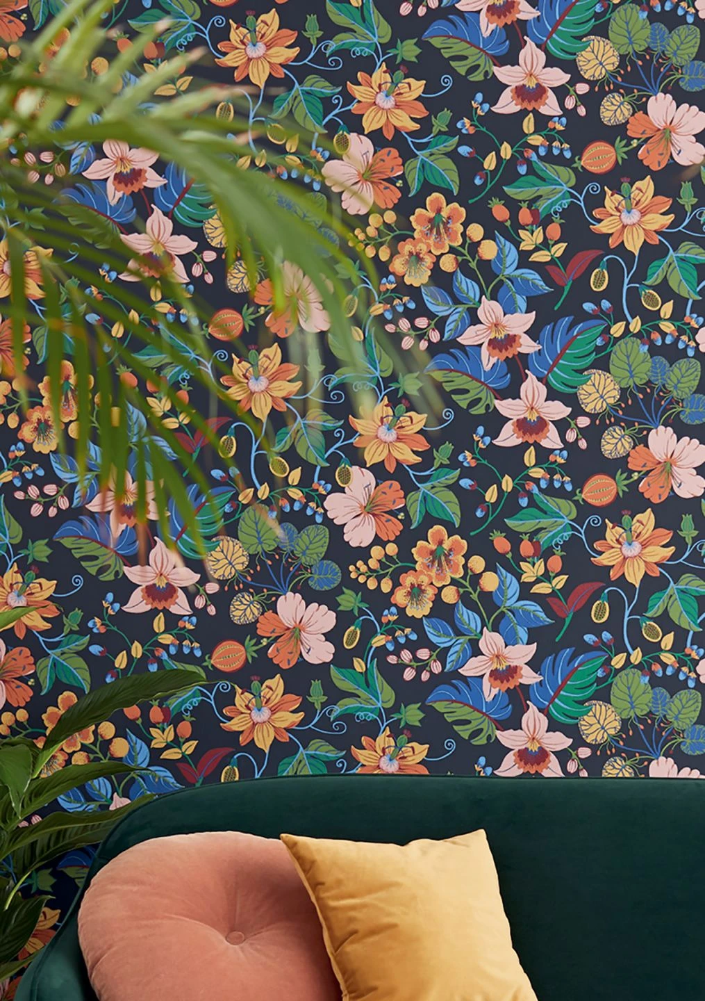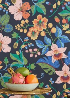 So sieht mexikanische Lebensfreude aus. Fruchtig, blumig und zum Anbeißen schön steht Designtapete Frederika bereit für den Indoor-Paradiesgarten. Das intensiv bunte Farbenspiel erhält seine Leuchtkraft durch die schwarze Grundfarbe. Die Leimdruck-Optik unterstreicht die malerische Wirkung der floralen Vliestapete.