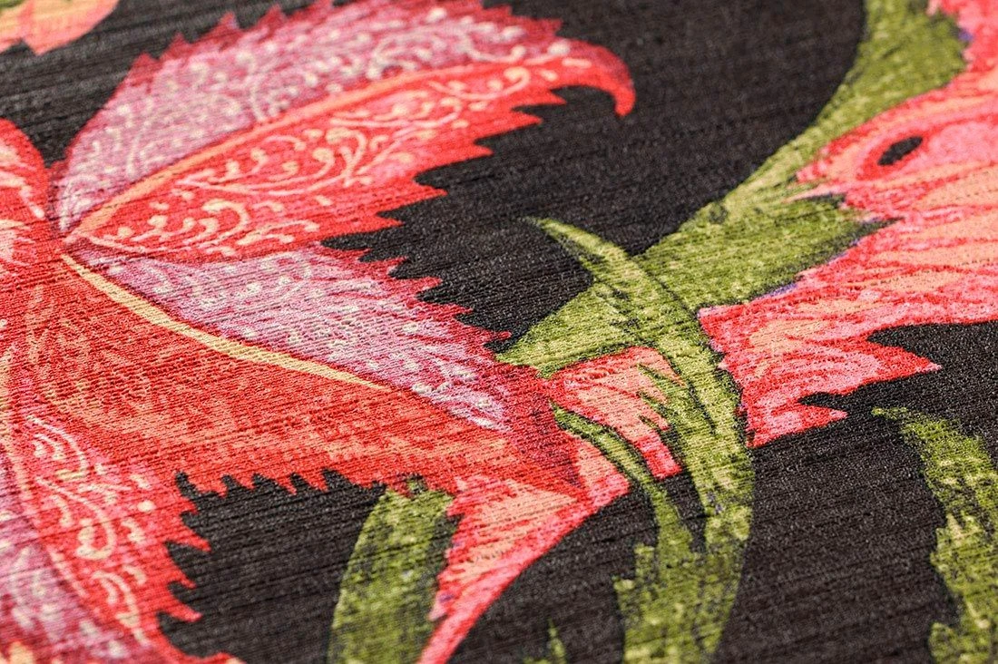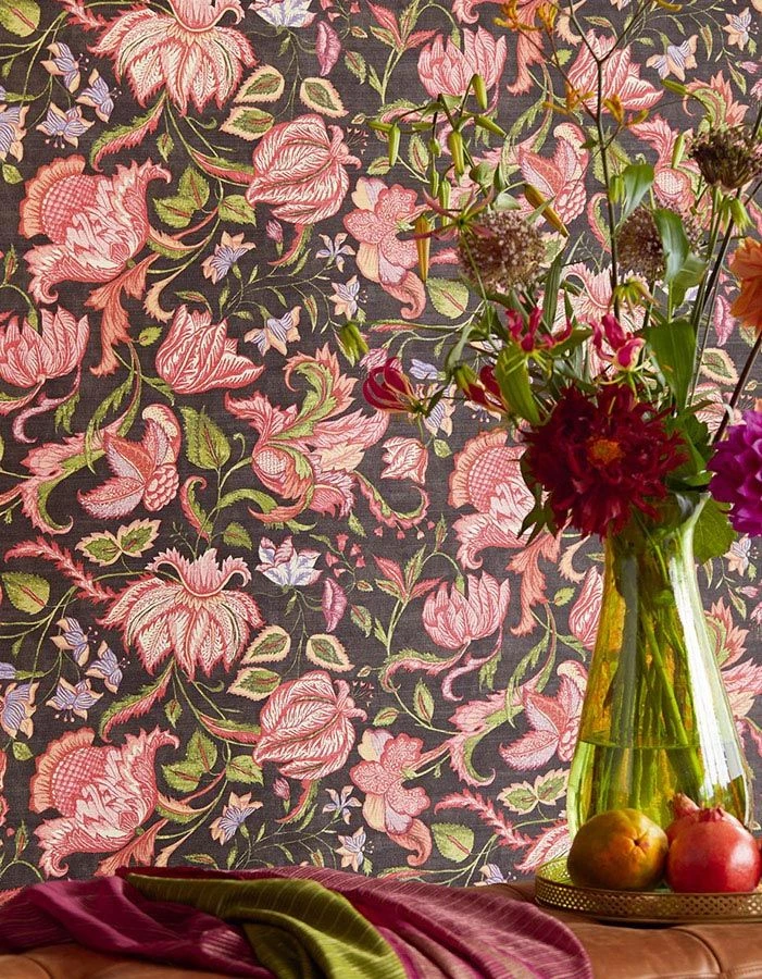 Indisches Blumenrohr und die zauberhafte Lotusblume haben Pate für die mondäne Blumentapete gestanden. Wie fein gewebt mutet die sanfte Struktur der Vinyltapete an, die auch in Feuchträumen wirkungsvoll zum Einsatz kommt. Auf schwarzgrauem Fond entfalten die Blütenranken in Cremeweiss, Erdbeerrot, Maigrün, Violett eine besonders expressive Stimmung.