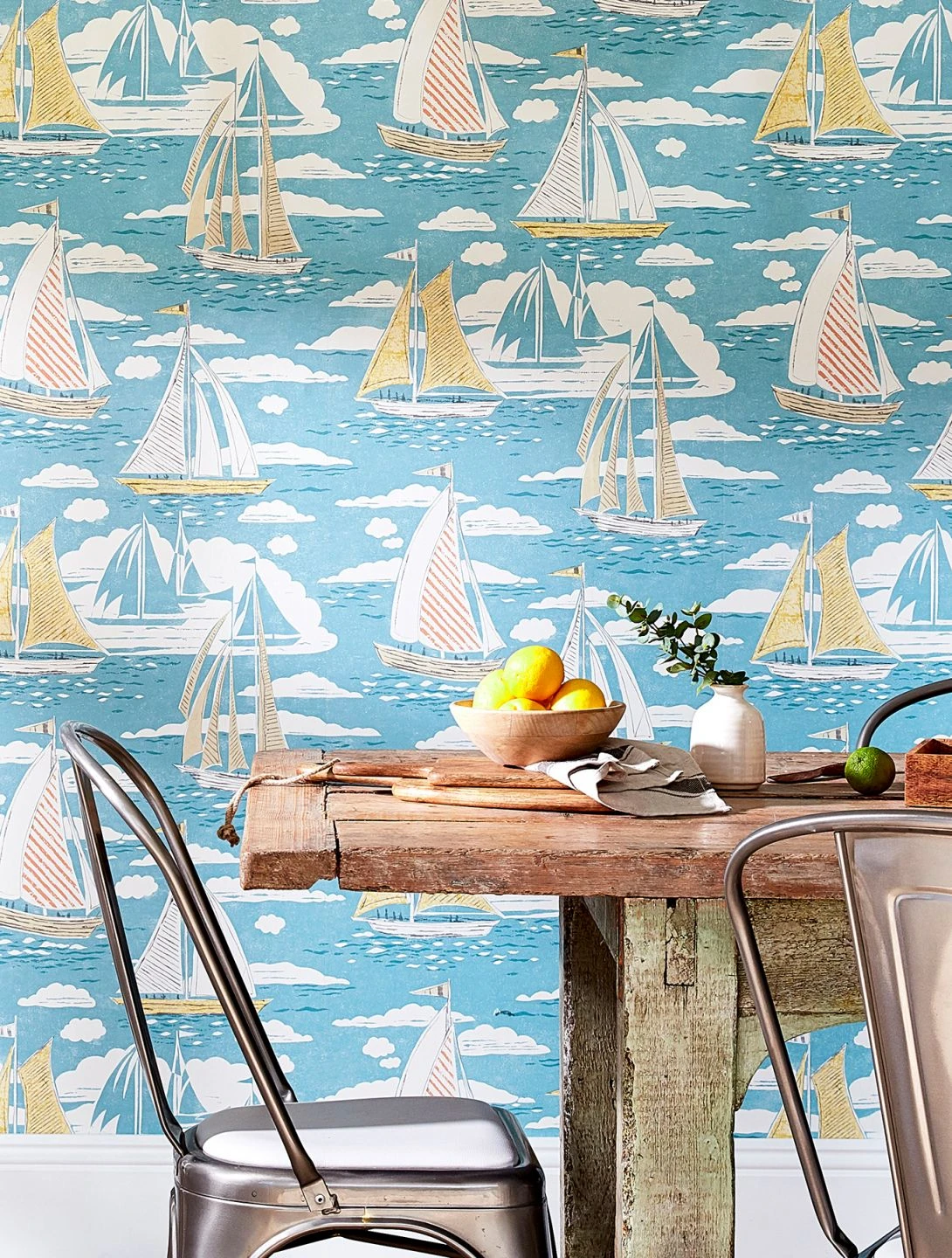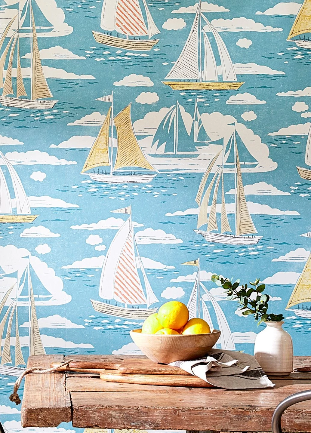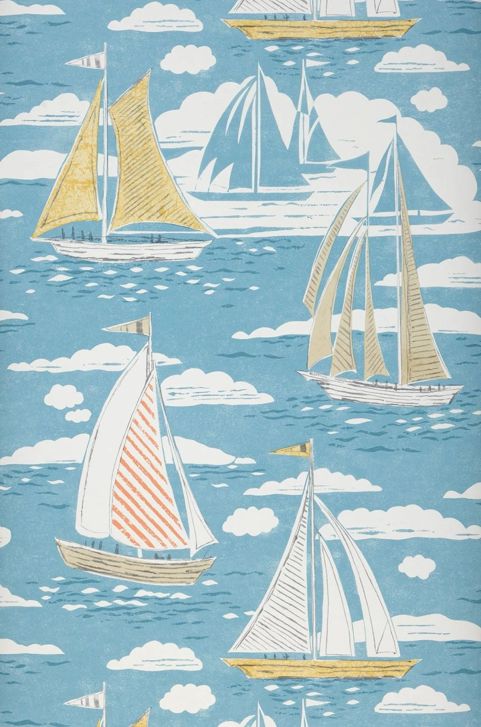 Bei so vielen Segelbooten kommt unweigerlich ein Gefühl von Urlaub und Freiheit auf! Die verschiedenen Bootstypen wirken handgemalt mit einem Hauch vom Charme der 50er Jahre. Der Clou des Designs: Meer und Himmel gehen ineinander über. Wellen plätschern zwischen weißen Schönwetterwolken. In großen Quellwolken sind die Boote als Silhouetten zu erkennen. Segeln sie über das Meer oder über den Himmel?