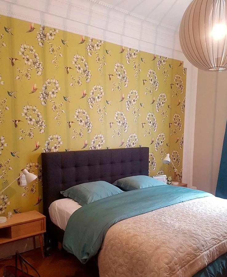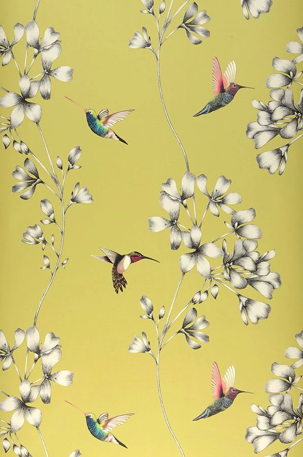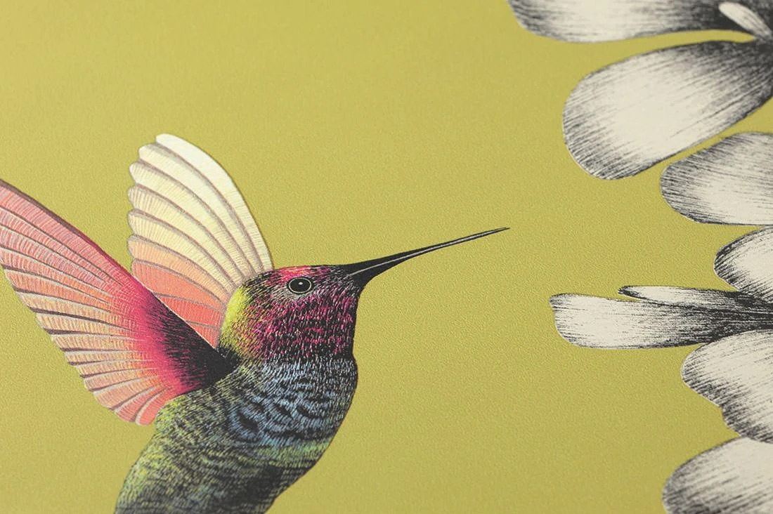 Sommerliches Grüngelb wetteifert mit den leuchtenden Farben der Kolibris und bildet einen lebendigen Kontrast zu den in zartem Schwarzweiß gehaltenen Blüten. Die Vielzahl an Farben lässt Ihnen mit dieser Vliestapete alle Freiheit der Kombinationsmöglichkeiten. Eleganz und Leichtigkeit strahlt sie in jedem Fall aus.