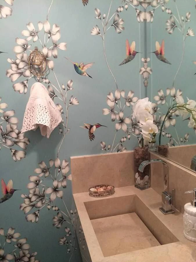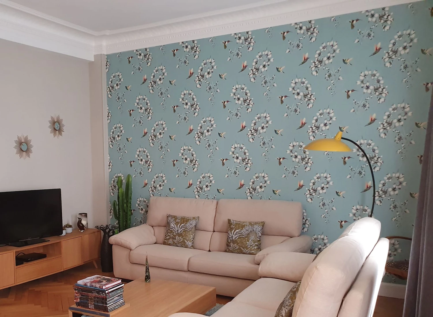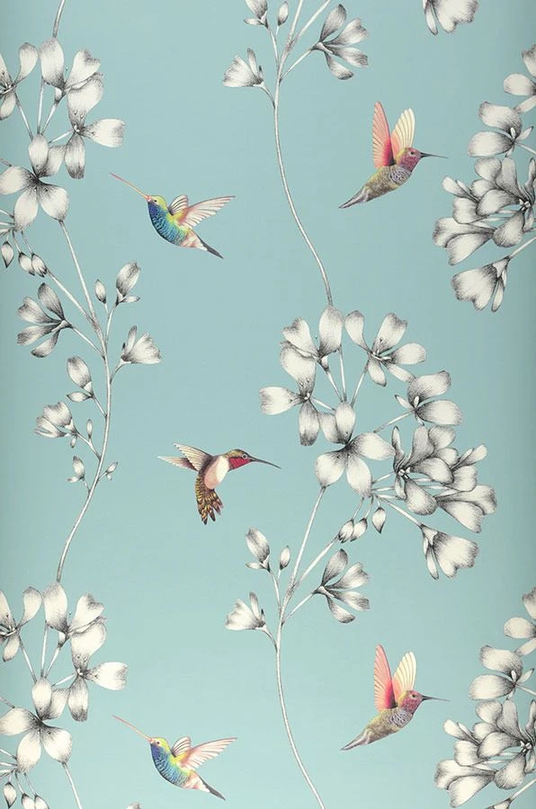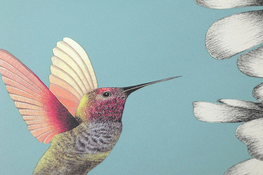 Kolibris umschwirren Blüten – und durch die schwarzweiße Zartheit der Blüten werden die bunten Farben der Kolibris besonders betont. Der pastelltürkise Untergrund lässt sich durch Möbel oder Wandfarben im selben Farbton harmonisch in das Interieur einfügen oder durch Creme- und Schlammfarben in den Mittelpunkt rücken. In jedem Fall entsteht ein geschmackvoller, sommerlich-leichter Raumeindruck.