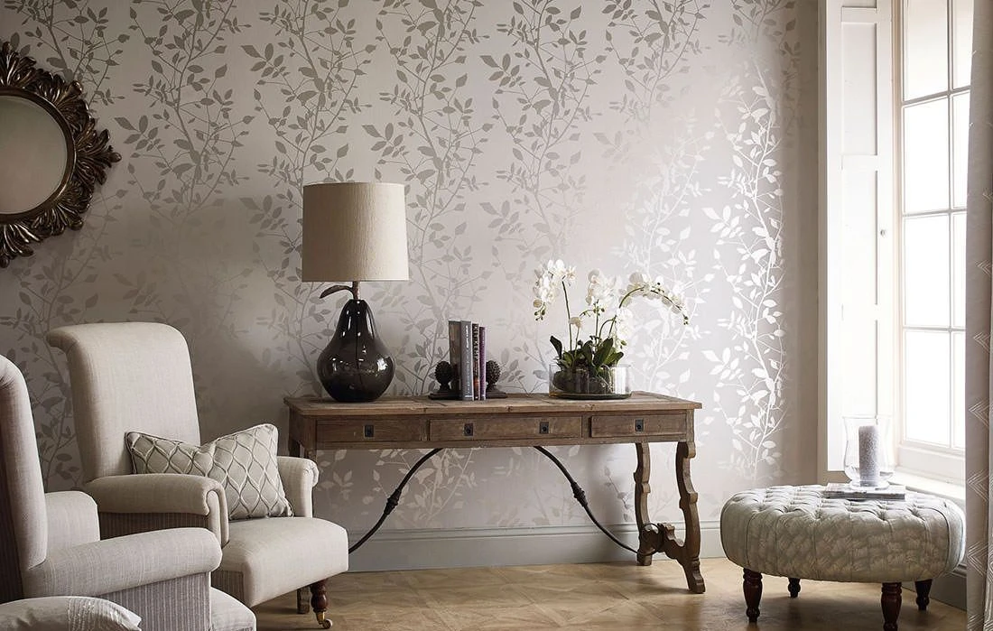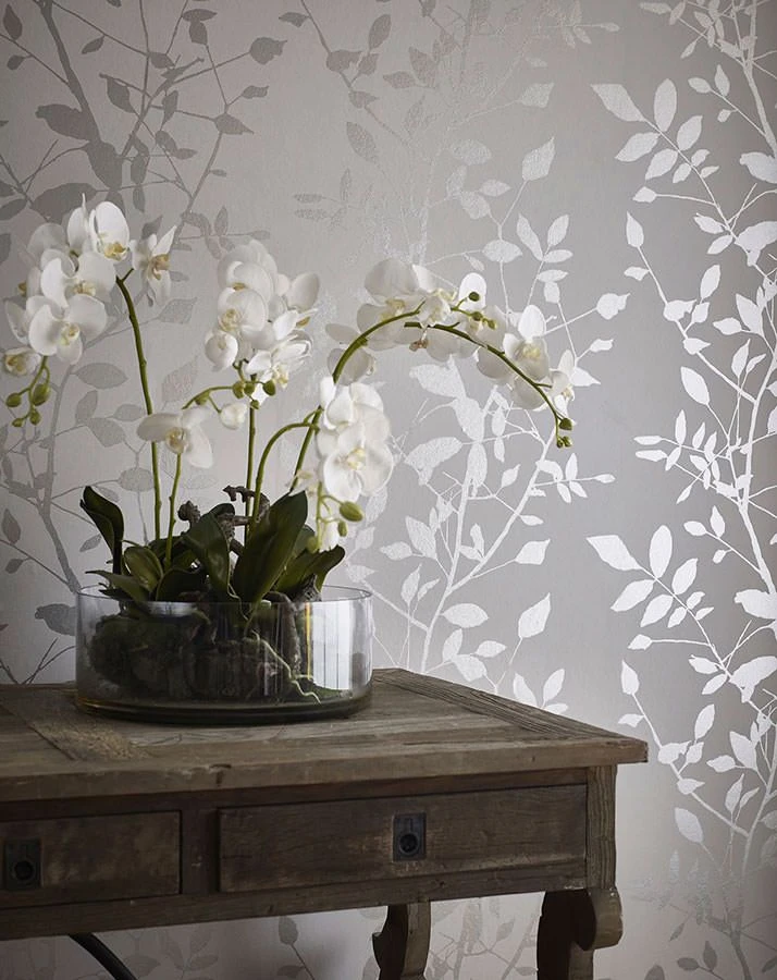 Ein wunderschöner Name für die Luxus Tapete mit üppigen Blätterranken, die den Raum wahrhaftig in Glanz und Gloria hüllen. Dafür sorgt das in Silber schimmernde Muster auf mattem Untergrund in Grauweiss. Das perfekte Understatement für Gestaltungsideen mit romantischer Ader und effektvoller Noblesse.