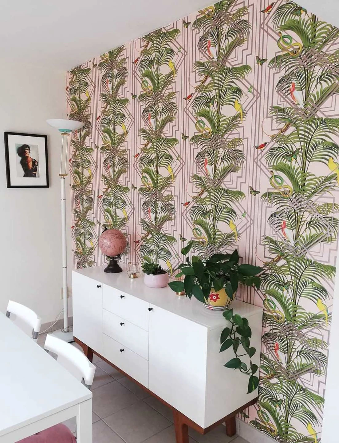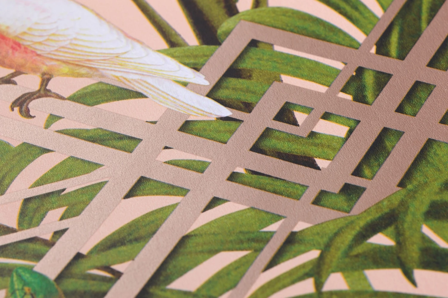 Farbenfrohe Exoten spielen mit dem symmetrischen Art Deco Muster und nutzen es für ihre Erkundung. Herrlich grüne Regenwaldpalmen unterstreichen die tropische Wirkung. Glanzvolle Effekte der geometrischen Silhouette verstärken die Leuchtkraft der bunten Farben auf dem zartrosa Fond.