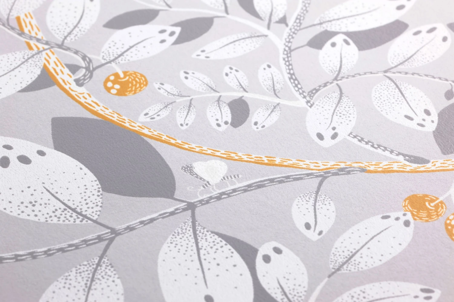 Sanfte, kontrastarme Grautöne bestimmen das Bild der Vliestapete Grada. Zwischen den Blattranken und Früchten sitzen schön geformte Schmetterlinge – alles in Dunkelgrau, Hellgrau und Weiß gehalten. Nur einzelne Zweige und Beeren werden durch ein kräftiges Ockergelb hervorgehoben und betont. Dass Grautöne keineswegs langweilig sind, sondern gerade in Verbindung mit einer Kontrastfarbe ein tolles Ensemble abgeben, ist hiermit bewiesen!