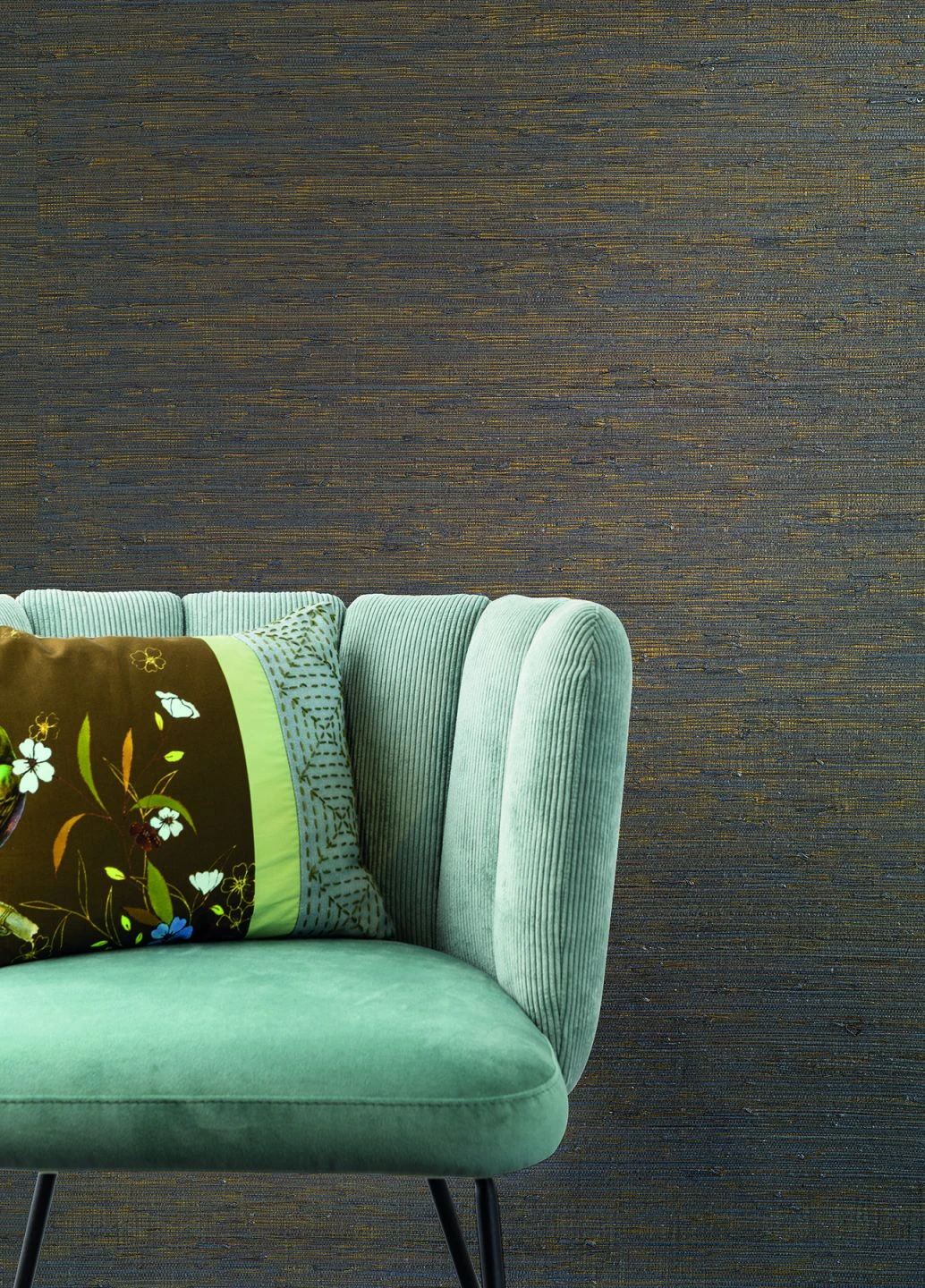Die natürliche, ungleichmäßige Struktur des verwobenen Materials – getrocknete Gräser von Feldern und Bergwiesen – wird durch die schimmernden Grau- und Goldtöne betont. Nicht nur haptisch, sondern auch optisch ist das Grasgewebe eine echte Besonderheit. Das Naturmaterial sorgt für Geborgenheit und einen Hauch von Glamour in einem angenehmen Raumklima.
