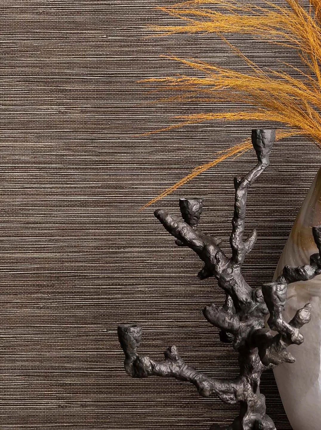 Die naturnahe Ausstrahlung einer Tapete aus echten Gräsern und die Unempfindlichkeit einer waschbeständigen Oberfläche vereint Grasscloth Illusion. Natürliche, dunkelbraune Farbtöne und die in das Vinyl eingeprägte textilähnliche Struktur von geflochtenen Grashalmen lassen die Tapete täuschend echt wirken. Im Unterschied zu echten Grastapeten können Sie diese Imitation jedoch auch in Bad oder Küche problemlos einsetzen.