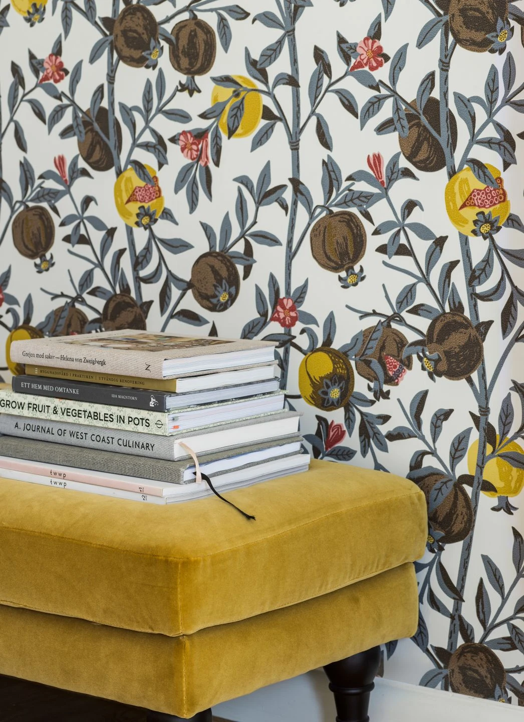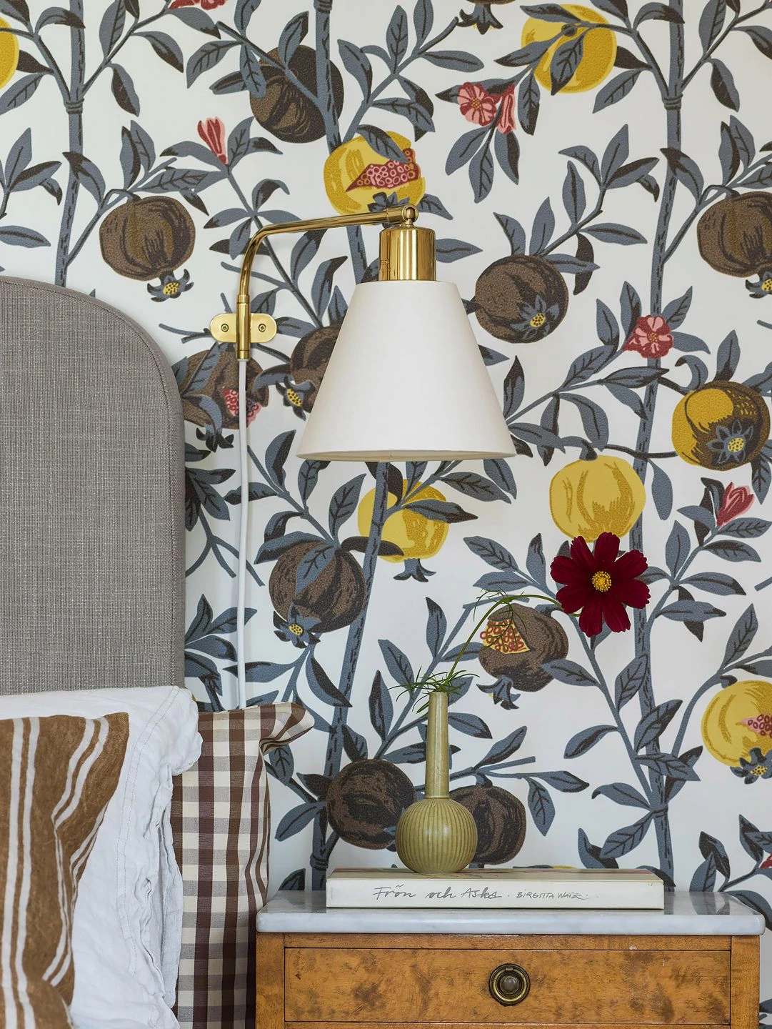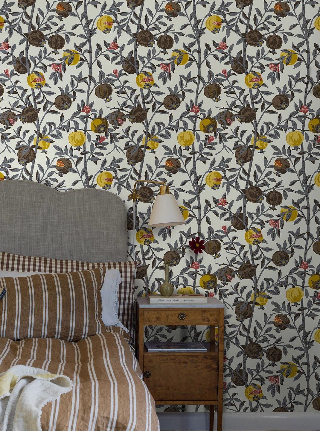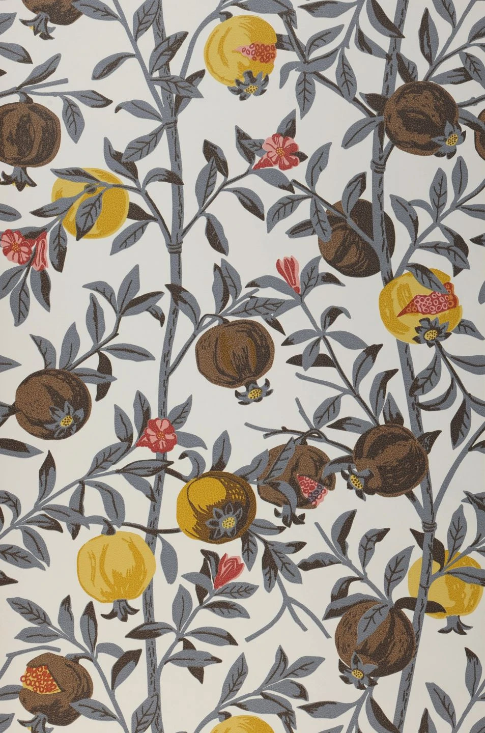 Intensive Farben vereinen sich auf dieser botanischen Tapete zu einer ungewöhnlichen, attraktiven Kombination. Das leuchtende Honiggelb und das gedeckte Sepiabraun der Granatäpfel, das Rubinrot der Blüten und das neutrale Basaltgrau der Zweige und Blätter heben sich schön vom weißen Untergrund der Vliestapete ab und kreieren eine geschmackvolle Kulisse für jeden Raum, den Sie damit schmücken. Die exotischen Früchte erzählen von der Süße und Fülle des Sommers.