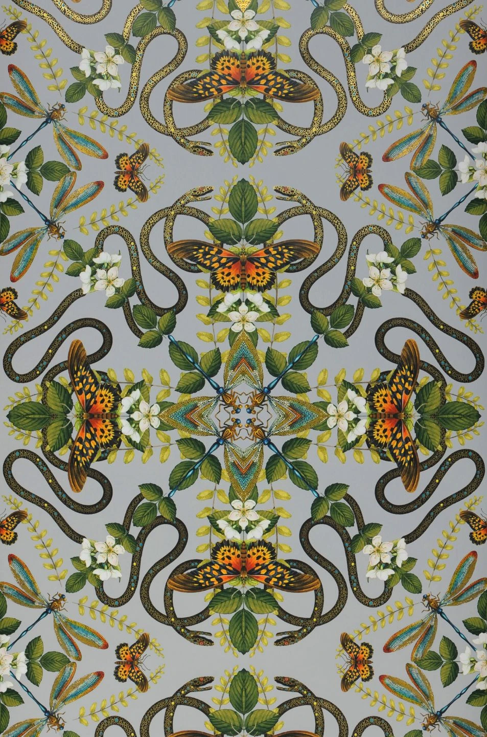 Die perfekte Symmetrie der Natur – die Zeichnung der Schmetterlingsflügel, die Anordnung der Blütenblätter und die Flügel der Libellen – trifft hier auf das symmetrische Arrangement der einzelnen Elemente des Musters. Schmetterlinge, Libellen, Blattranken, Blüten und Schlangen bilden ein mehrfach symmetrisches Ganzes wie beim Blick durch ein Kaleidoskop. Der hellgraue Untergrund lässt die schimmernden Musterfarben wunderbar zur Geltung kommen.