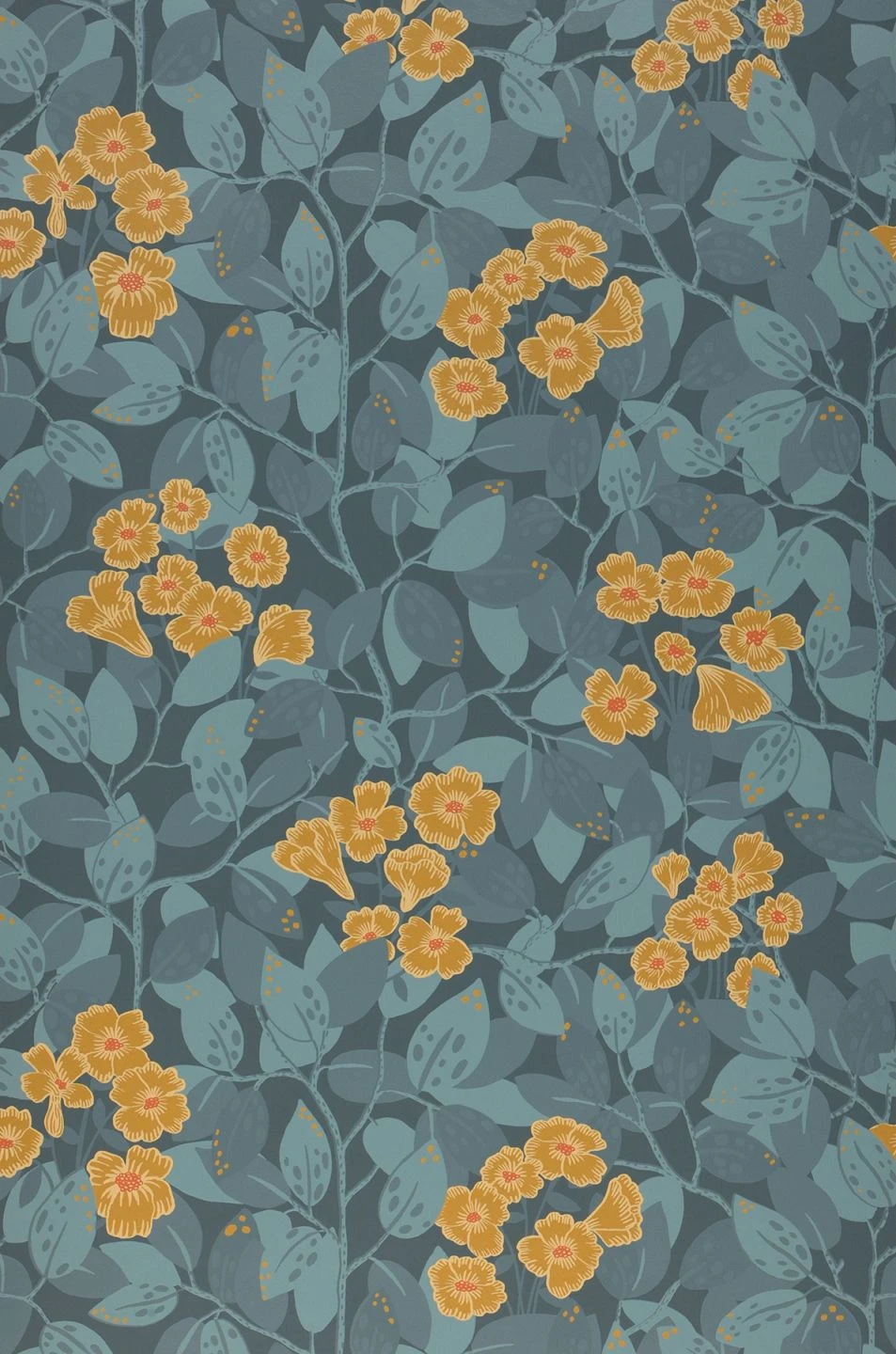Geheimnisvolles Graublau bildet den Hintergrund und – in helleren Schattierungen – das Blättergewirr, aus dem Blüten in leuchtendem Ocker hervorstechen. Die Farbzusammenstellung lässt unweigerlich an die blaue Stunde denken, in der alle Blautöne besonders leuchten, während die hellen Farben der Blüten sich umso kräftiger davon abheben. Blätter und Blüten sind mit feinen Details versehen, die ihnen Plastizität verleihen.