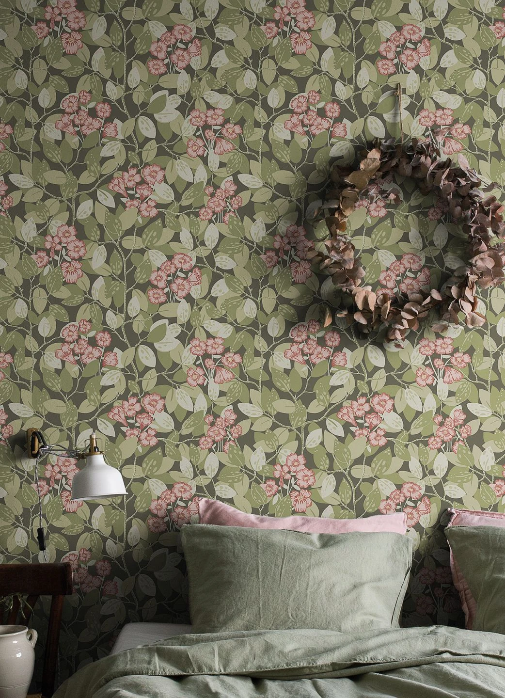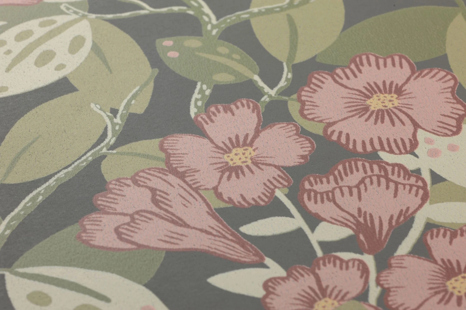 Inmitten eines Blätterwaldes aus Schilfgrün und zartem Hellgrün wachsen immer wieder hellrosa gefärbte, mit Weinrot abgesetzte Blüten. In der Kombination mit den passenden Farben Ihrer Möbel entsteht ein ungemein harmonisches Gesamtbild. Die Vliestapete gibt hellen Möbeln, aber auch Vintage-Einrichtungsgegenständen einen perfekten Hintergrund.