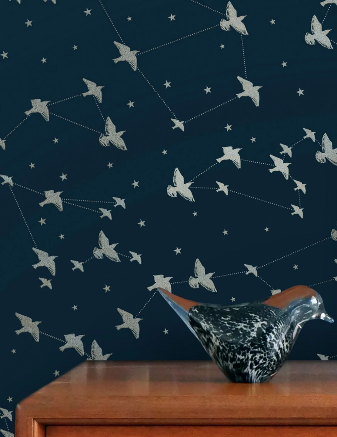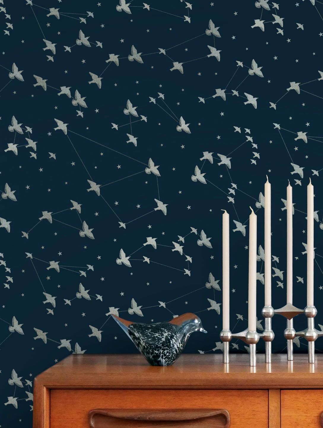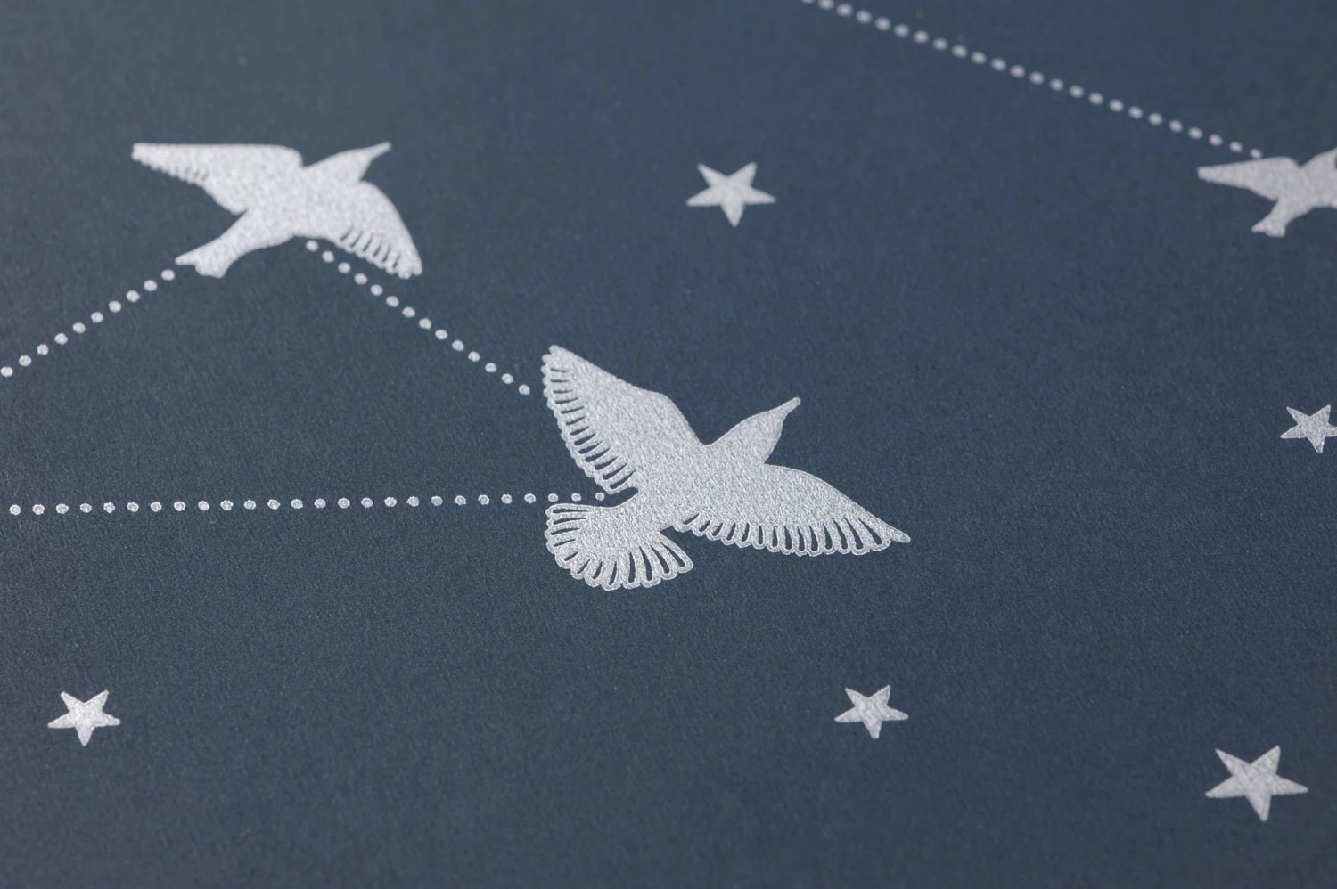 Ein magischer nächtlicher Sternenhimmel, an dem die Vögel ihre Bahnen in Sternbildern ziehen – Die klärende und befreiende Wirkung, die von der romantischen Designtapete mit silberglänzenden Musterelementen ausgeht, macht sie zu einem stilvollen Wandkleid für Schlafzimmer, Kinderzimmer oder Bibliothek.