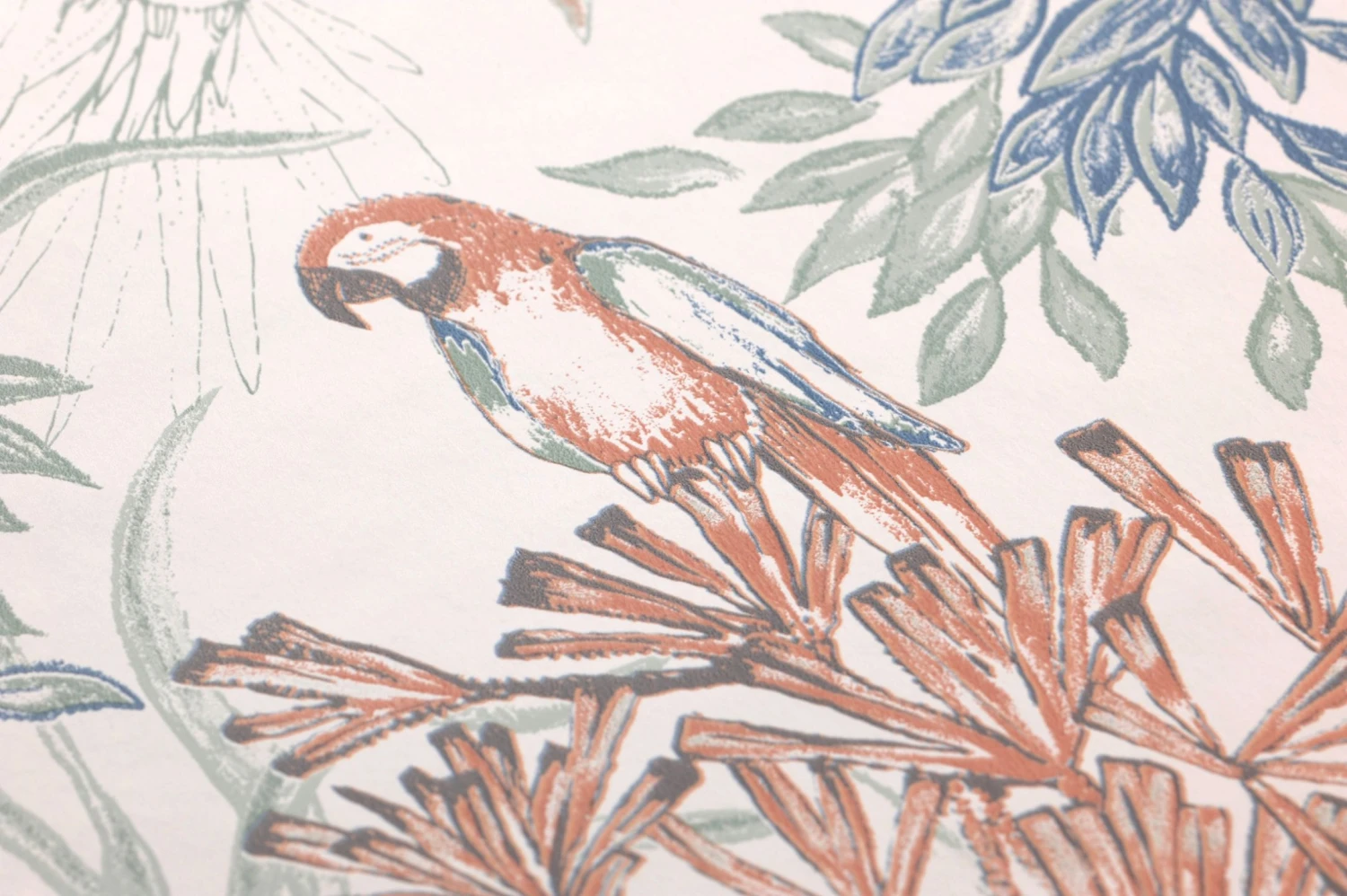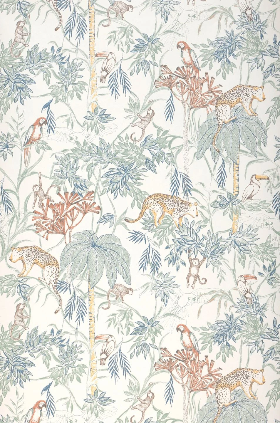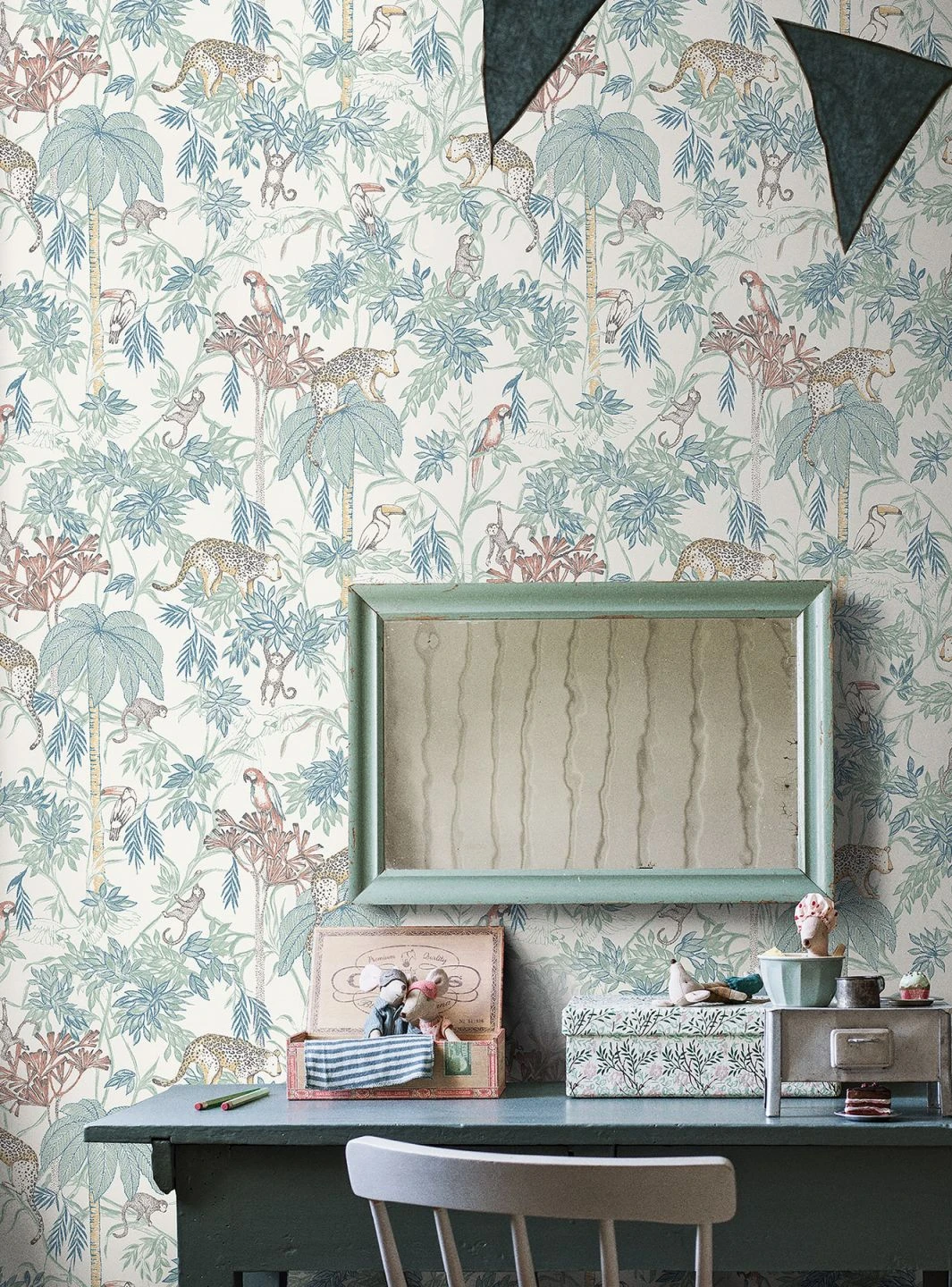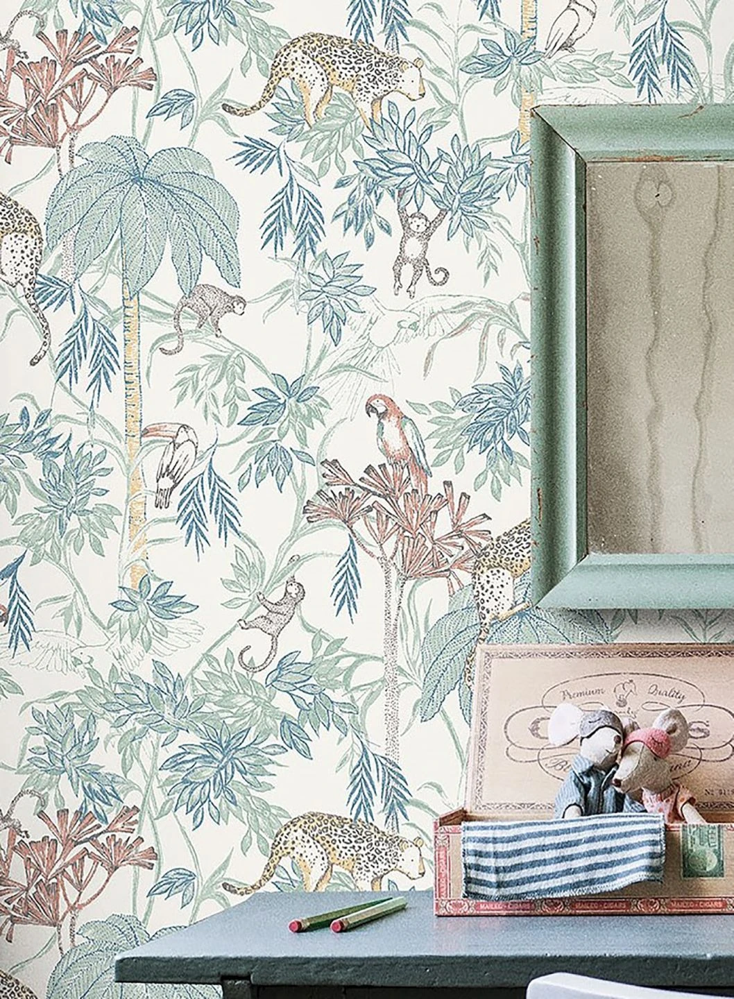 Papageien und Tukane, Äffchen und Leoparden tummeln sich in einem Dschungel aus exotischen Palmen, Sträuchern und Schlingpflanzen. Die cremeweiße Struktur des Hintergrunds lässt die Vliestapete hell und freundlich wirken und bringt die Farben der Illustrationen zur Geltung. Eine Tapete, wie geschaffen für ein Kinderzimmer, in dem ein kleiner Entdecker und Weltreisender seine nächste Expedition in Nachbars Garten plant.