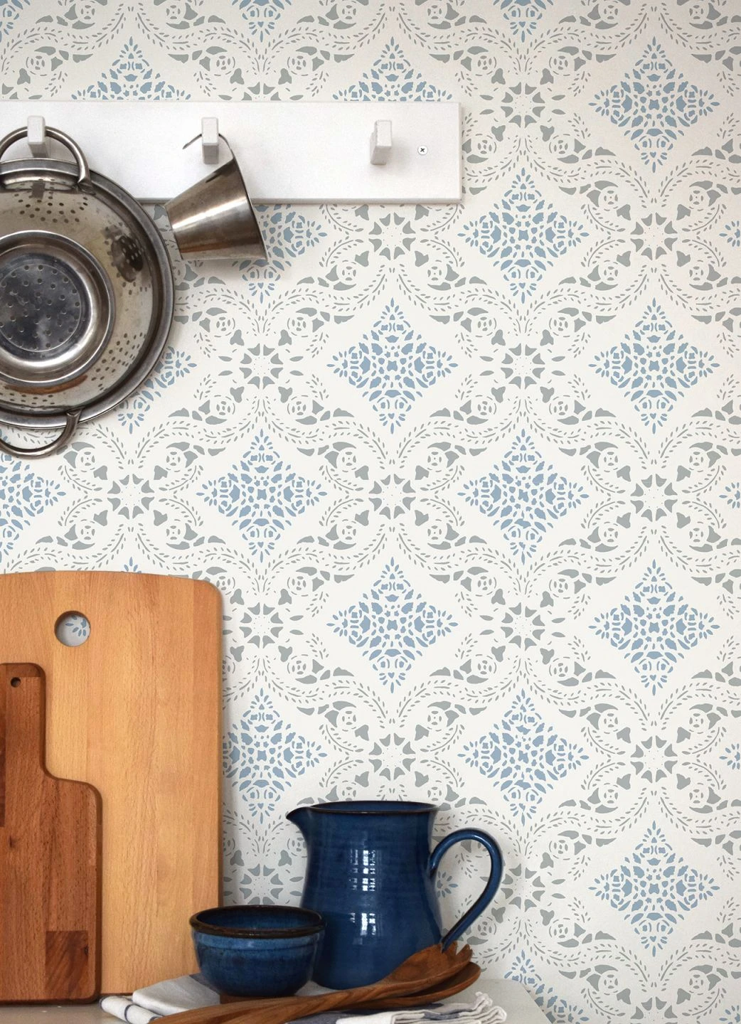 Freunde der ländlich edlen Romantik zieren mit diesem historischen Rautenmuster Küche, Esszimmer oder Schlafraum und schwelgen in der guten alten Zeit. Die harmonische Farbstellung in Grau, Blau, Weiß erlaubt Kombinationen mit allen Holznuancen, aber auch mit Weiß und Shabby Chic Farben. Die Leimdruck Optik der eleganten Vliestapete macht den authentischen Charakter perfekt.