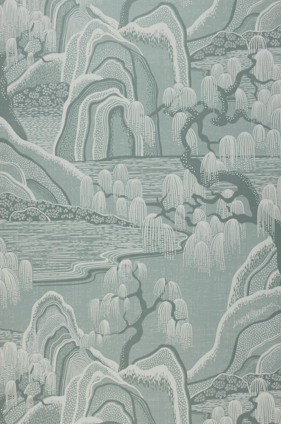 Das helle Minttürkis des Untergrunds bestimmt die Farbwirkung dieser Vliestapete. Nur angedeutet mittels grauweißer und minttürkisfarbener Linien, Punkte und Farbtupfer, aber deutlich zu erkennen ist die Landschaft eines japanischen Parks – voller Bäume und Blumen, Teiche und Berge. Entweder Ton in Ton oder mit dunklen, sachlichen Möbeln – die Tapete bietet vielfältige Kombinationsmöglichkeiten und eine Kulisse, in der man den Blick schweifen lassen kann.