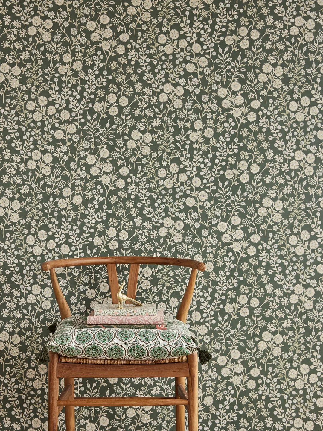 Das Blumenmuster der Vliestapete Jessica trifft die ideale Mischung aus modernem skandinavischen Design, ruhigen Farben und einem Hauch von nostalgischer Geborgenheit. Die hellen Umrisse der Blumen, Beeren und Blätter auf dem tannengrünen Grund wecken die Erinnerung an Sommerferien in Schweden zwischen Wäldern, Wiesen und Seen. Unbeschwertheit und ein wohliges Gefühl des Zuhauseseins durchströmen Ihr Wohnzimmer oder Ihre Küche im skandinavischen Stil oder im Landhaus-Stil.
