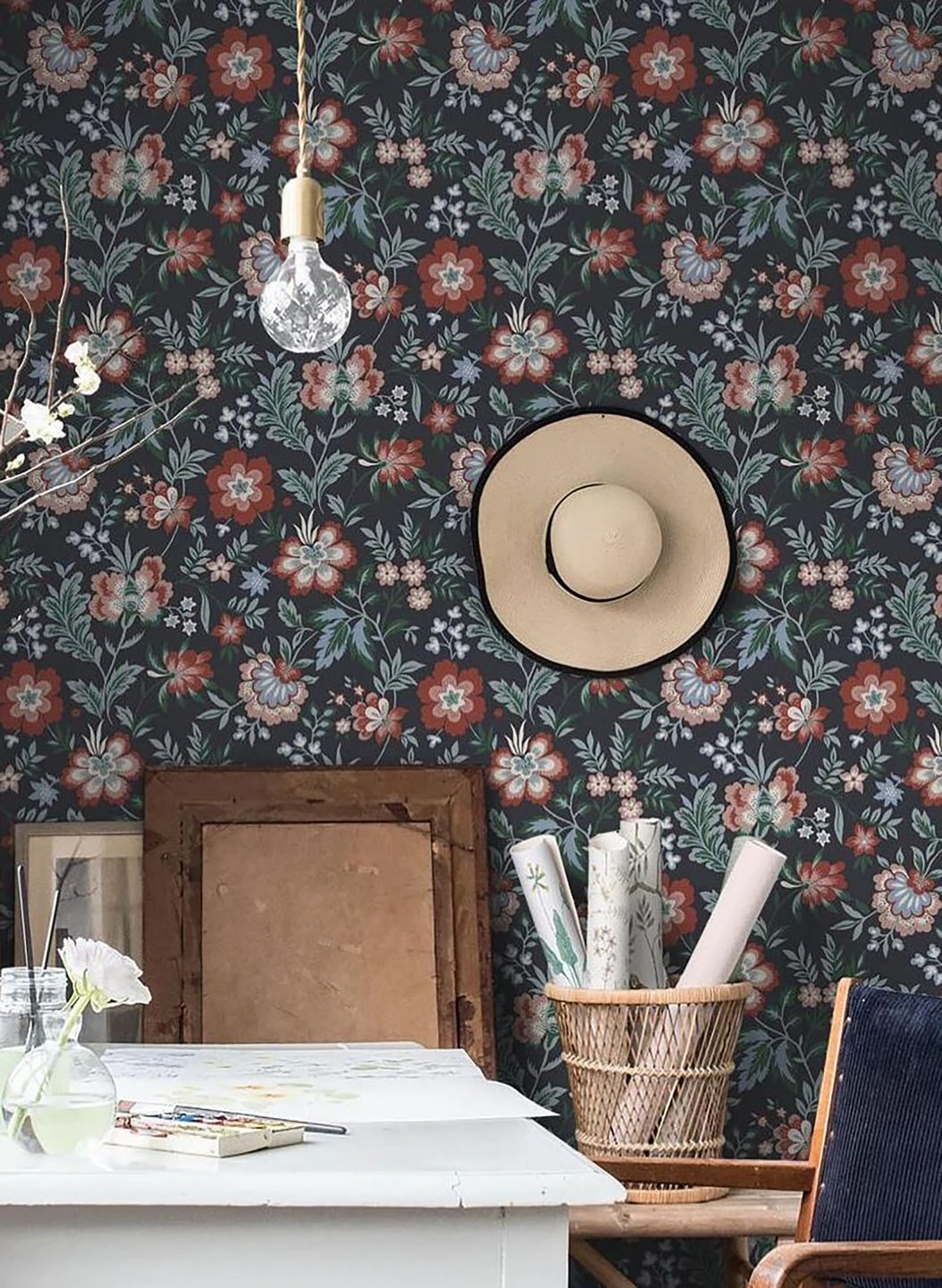 Wie große Hibiskusblüten wirken die stilisierten Blumen, die im Mittelpunkt dieser floralen Tapete stehen. Das Rosé und Rot ihrer Blütenblätter wird von kleineren Blumen und Blättern in Grün und Pastellblau begleitet. Die ausladenden Formen der Blüten erinnern an Ornamente aus der orientalischen Kunst. Auf dem anthrazitfarbenen Hintergrund der Vliestapete entwickeln die Farben des Musters eine intensive Leuchtkraft.