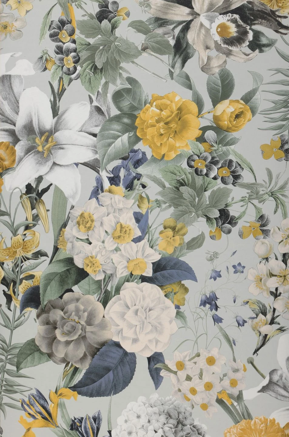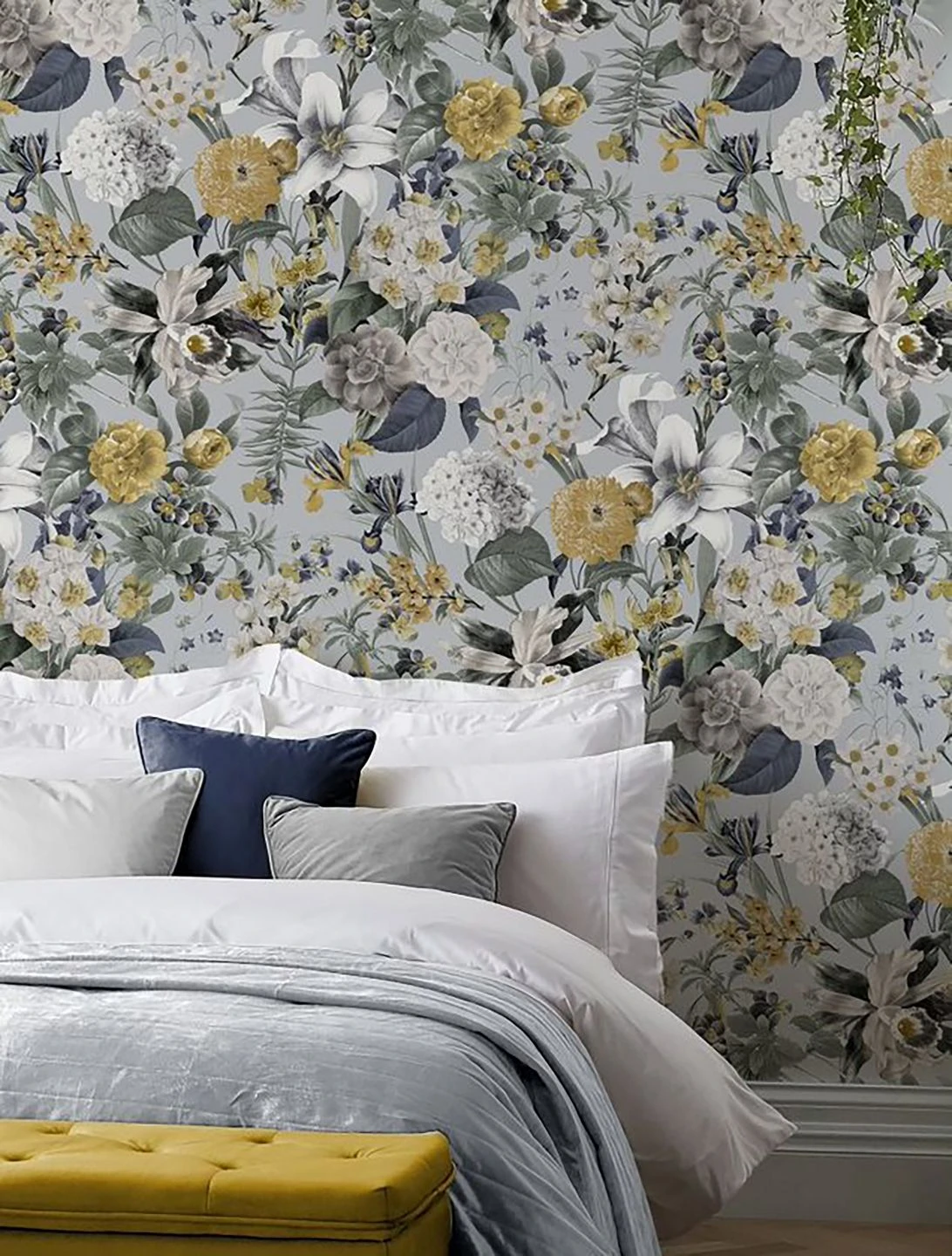 Üppig und kraftvoll wirken die dicht an dicht arrangierten Blüten, die die Vliestapete „Julia“ so lebendig machen. Gleichzeitig strahlt die Tapete Leichtigkeit aus, denn zwischen den blassen Grün- und Blautönen der Blätter herrschen durch helle Grautöne abgesetztes Weiß und Gelb auf dem lichten zartgrünen Untergrund vor. Ein romantisches Schlafzimmer oder ein gemütliches Wohnzimmer finden mit dieser Tapete ihre Vollendung.