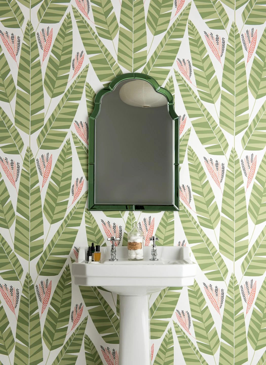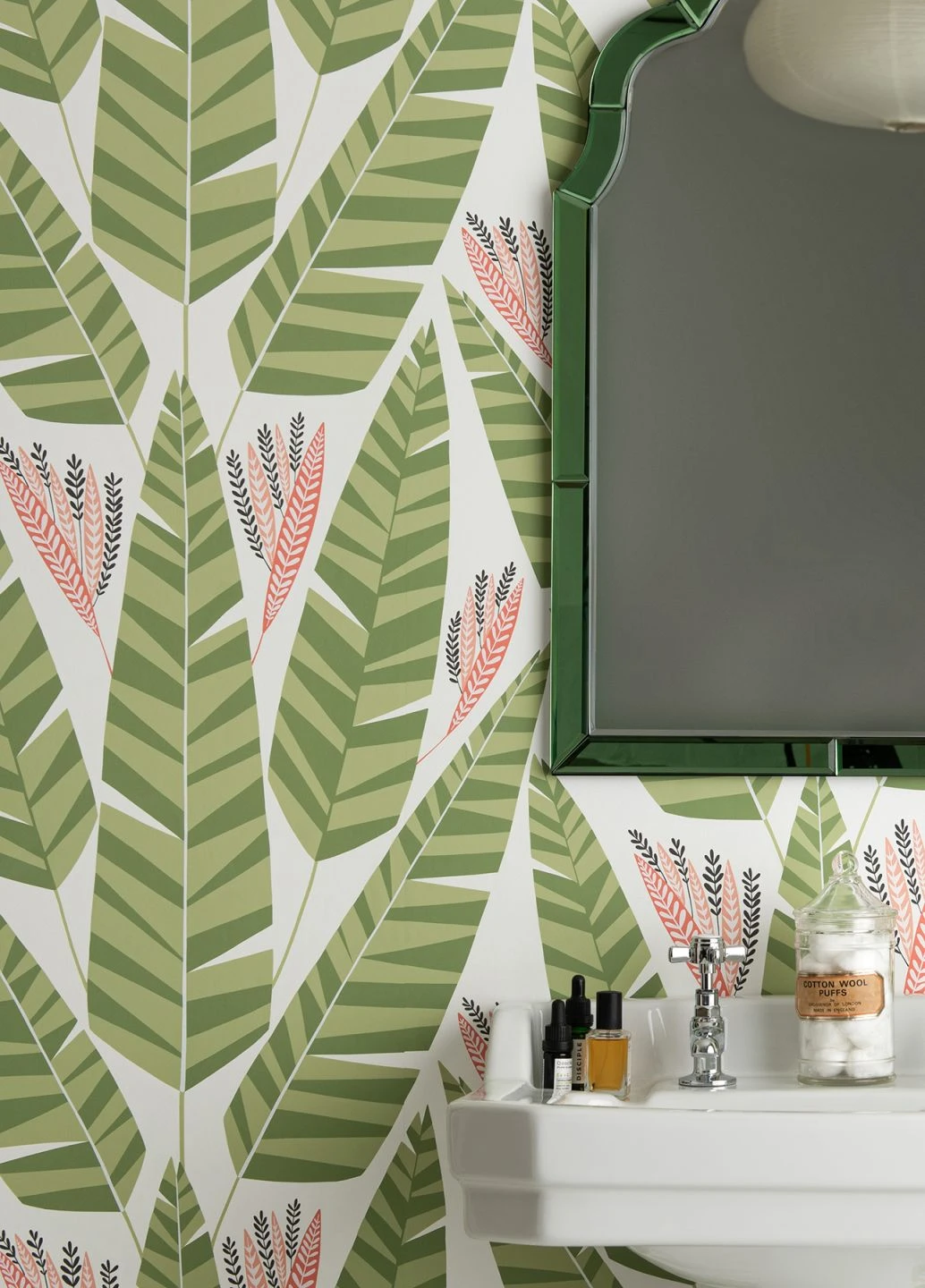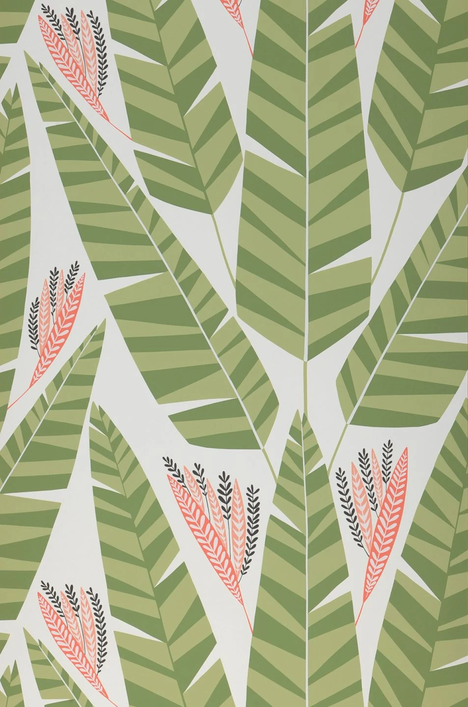 Aus Streifen von Resedagrün und Blassgrün setzen sich große, stilisierte tropische Blätter zusammen. Dazwischen erblühen zarte Blüten in verschiedenen Schattierungen von Lachsrot. Es entsteht ein abstrakter Dschungel mit exotischen Pflanzen. Die besondere Ästhetik der Vliestapete erlaubt eine große Auswahl von Kombinationsmöglichkeiten ganz nach Ihrem Geschmack.