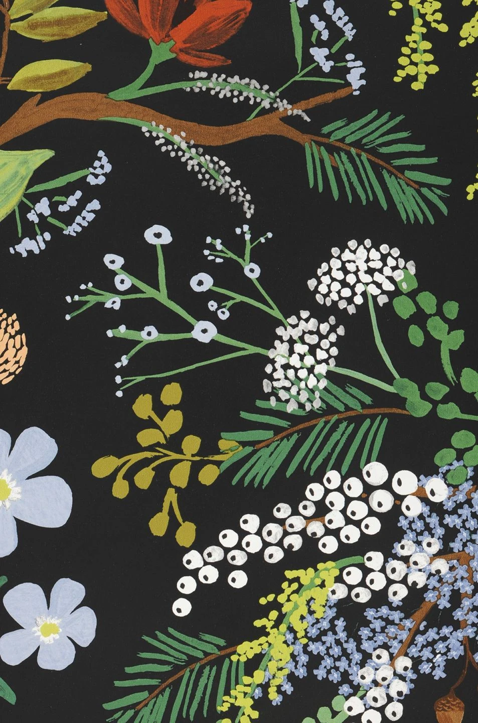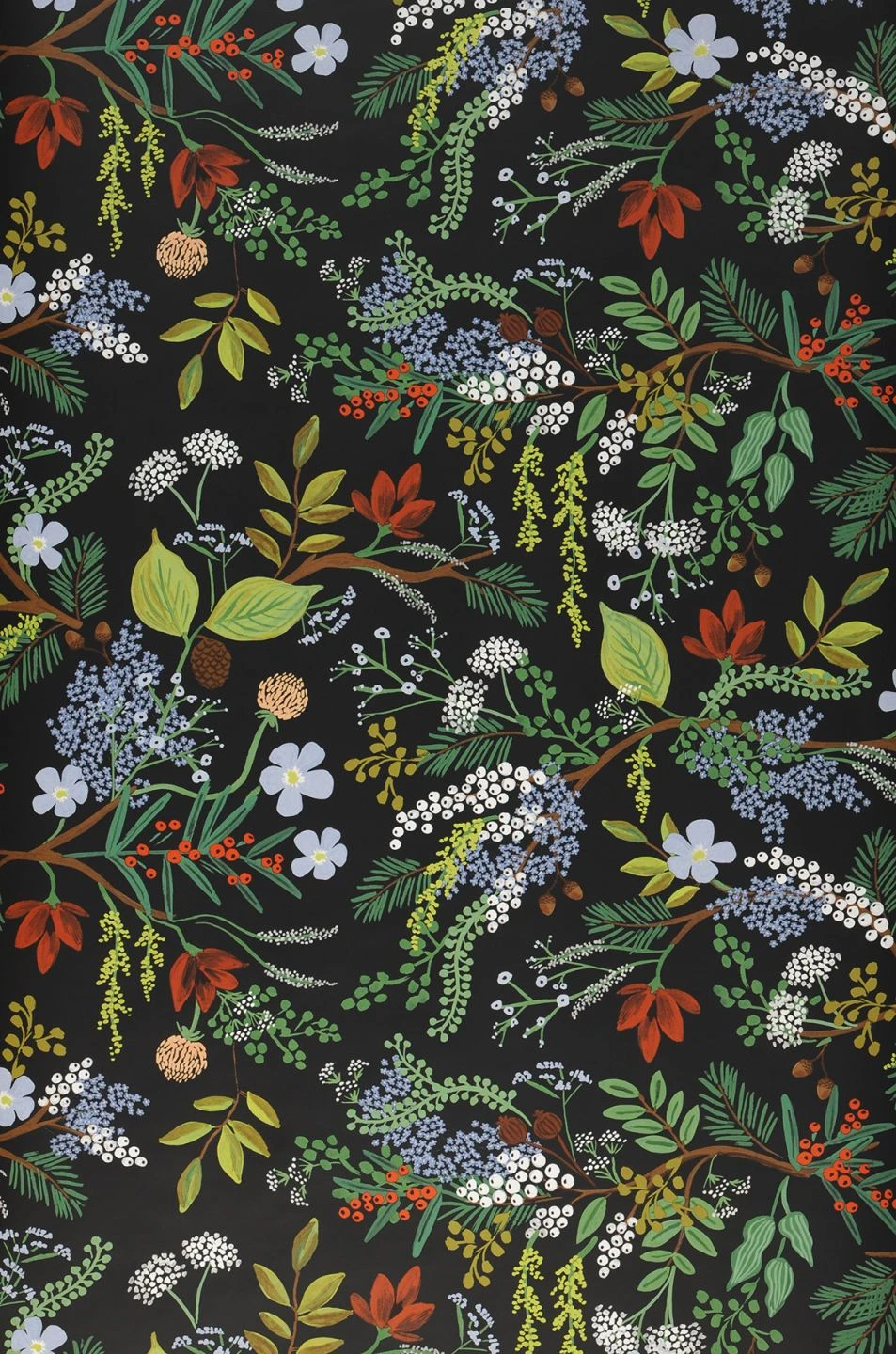 Eine bunte Vielfalt von verschiedenen Blüten, Blättern und Früchten bildet einen lebhaften Gegensatz zum dunklen Untergrund der Papiertapete, der die kräftigen Farben besonders zum Leuchten bringt. Wie mit Pinseln auf das Papier getupft sehen die Blätter und Blüten aus. Durch diese Technik wirkt die Tapete gleichermaßen edel wie leicht.