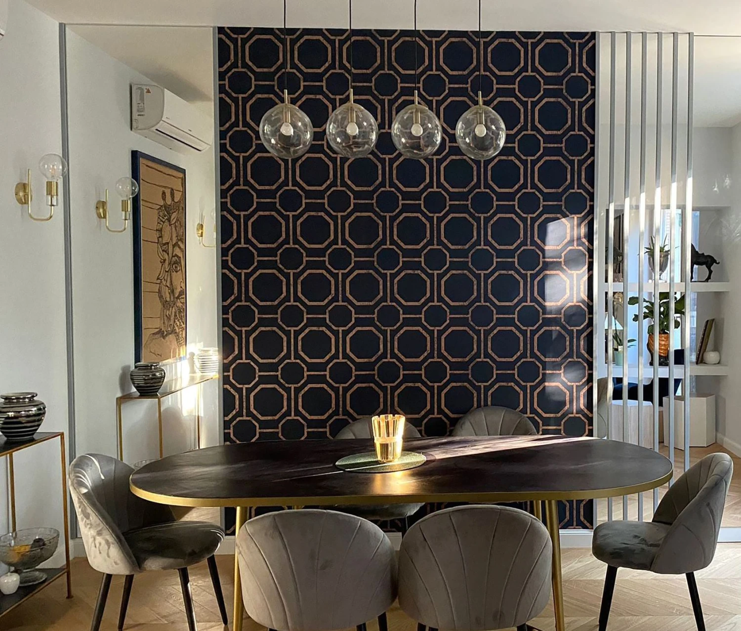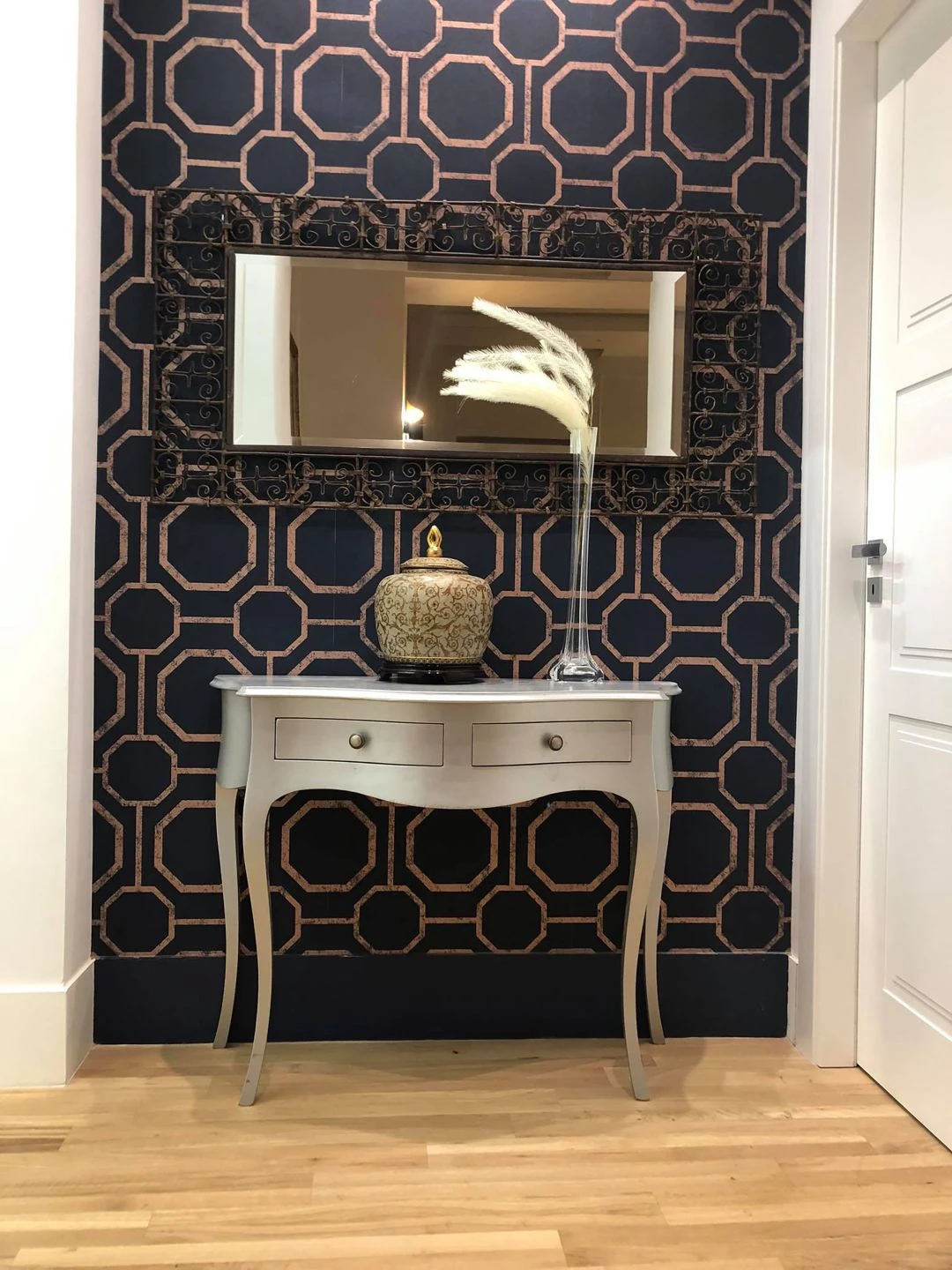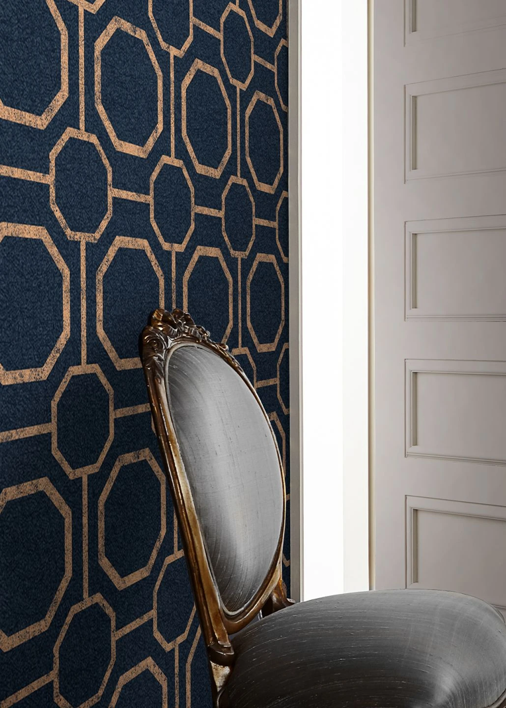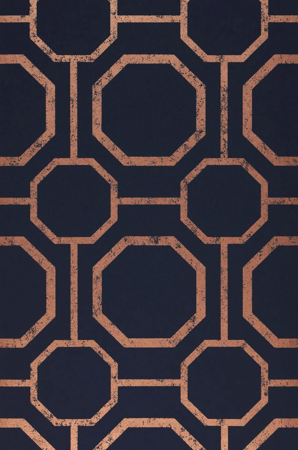 Schimmerndes Rosenholz, das wie helles Kupfer glänzt, bildet den Rahmen für das moderne Achteckmuster. Der dunkelblaue Grund erlaubt verschiedene Wirkeffekte je nach Einrichtung. Massiv wie Industrial oder majestätisch wie Barock. Gerne können Sie auch mit anderen Stilrichtungen experimentieren. Vliestapete Kalea mit abwaschbarer Oberfläche bleibt hier offen für alles.
