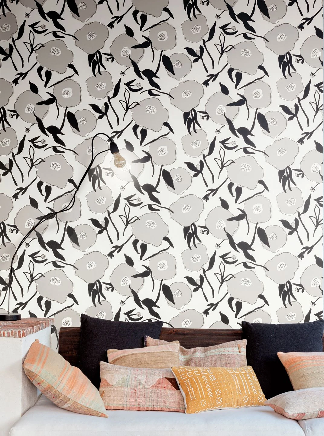 Ein eindrucksvolles Schwarzweißbild bringt die florale Tapete Kanoko an Ihre Wand. Mit wenigen Strichen sind stilisierte Blumen mit großen Blüten, Knospen und Blättern angedeutet. Die Beschränkung auf graue und schwarze Linien und Flächen auf dem weißen Grund verstärkt den stilisierten Effekt der expressiv gemalten Blumen. Kanoko führt die Tradition des Blumenmusters in eine neue Dimension.