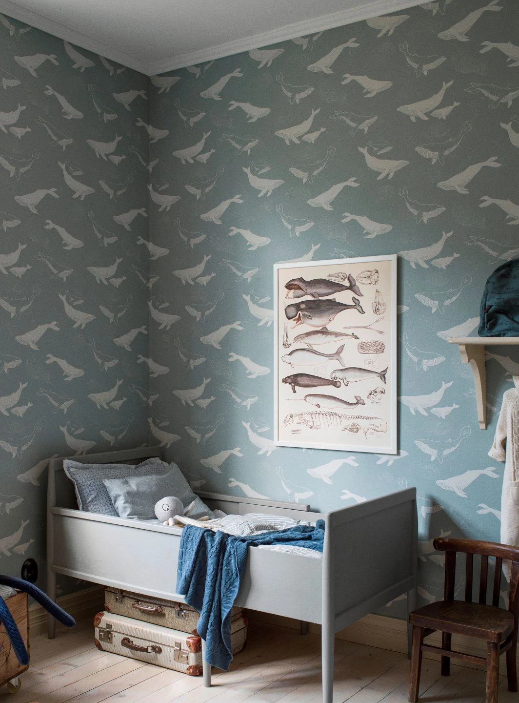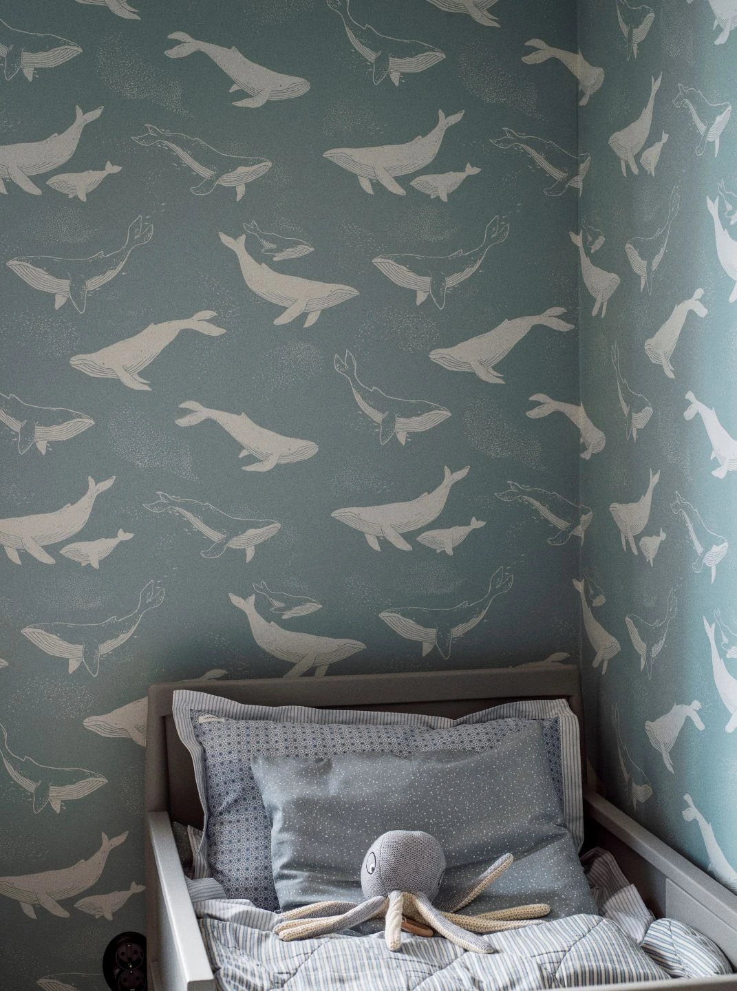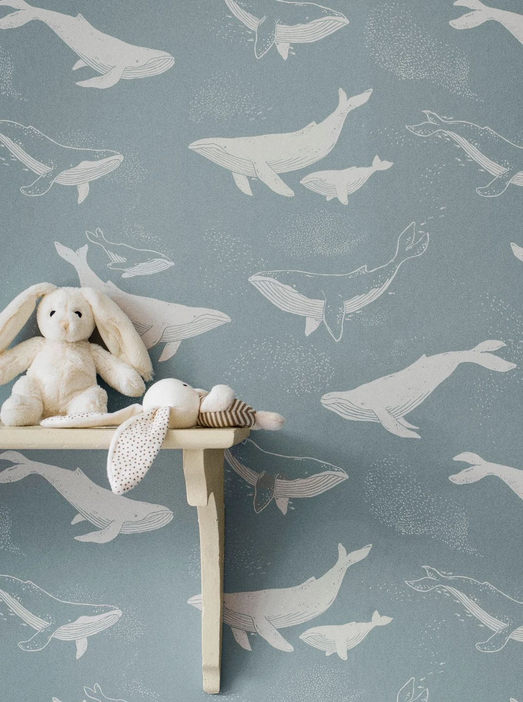 Wale, die sanften Riesen der Weltmeere, sind faszinierende Tiere. Ihre Größe, ihr scheinbar schwereloses Gleiten durch die Ozeane, ihre Gesänge, ihr Sozialverhalten sind einzigartig. Und so ist Vliestapete Keiko mit ihren cremeweißen Blauwalen auf dem hellblaugrauen Grund nicht nur für ein Kinderzimmer eine tolle Kulisse. Warum nicht ein Schlafzimmer damit ausstatten und zwischen den riesigen Meeressäugern Erholung und Entspannung finden?