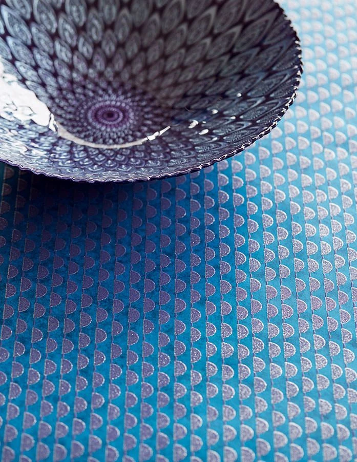 Die Tiefe des Meeres und die schillernde Schönheit seiner Lebewesen spiegelt Luxus Tapete Kelem in intensivem Blau wieder. Violett Glitzer als Musterfarbe und die fühlbar erhabene Struktur der Elemente stehen für die Pracht und Vielfalt der Unterwasserwelt. Gönnen Sie sich diesen Hochgenuss tiefgründiger Entspannung.