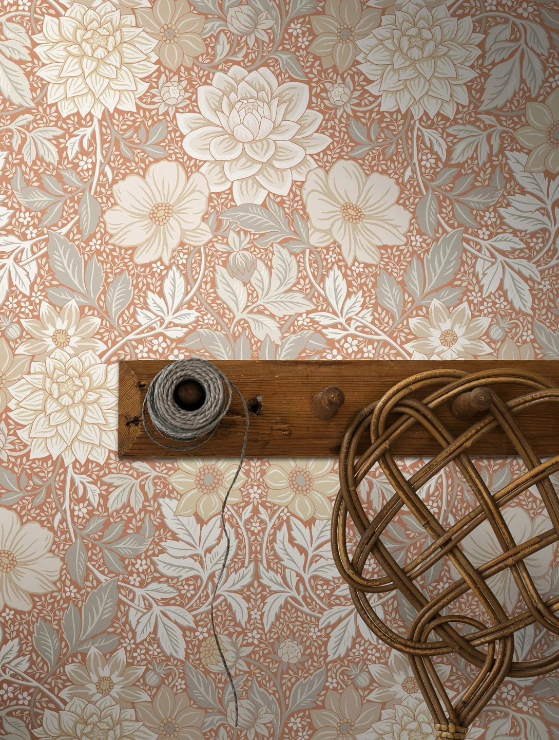 Eine Portion Nostalgie ist mit im Spiel bei der im Leimdruckverfahren hergestellten floralen Tapete Kerala. Denn die vielfältigen stilisierten Blumen und Blattranken, aber auch die Farbgebung erinnern an Designs aus der Epoche der Symbolisten und des Jugendstils. Der kupferbraune Untergrund gibt den zarten Hellgrau-, Hellgraubeige- und Weißtönen der kunstvoll arrangierten Blumenranken einen kräftigen Halt und einen farblich abgestimmten Rahmen.