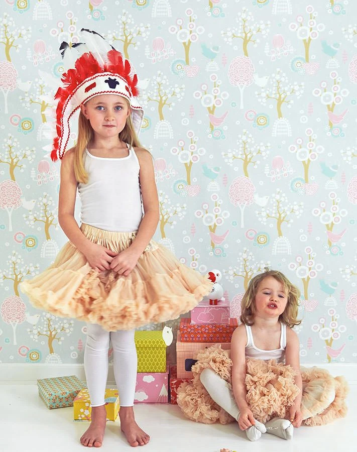 Heimelig und zauberhaft stimmt das romantische Naturszenario auf den Tag oder die Nacht ein. Die harmonisierende Farbgebung in Hellgrau, Altrosa, Hellbraunbeige, Hellpastelltürkis und Weiss verleiht dem Raum einen warmen, weichen Charakter und stimmungsvolle Helligkeit. Hier können Kinderträume wahr werden!