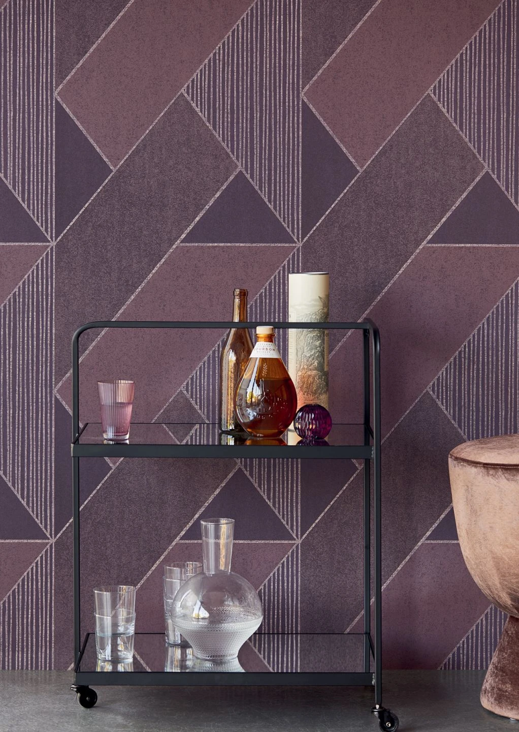 Fruchtige Beerentöne in Violett lassen Rechtecke, Dreiecke und Linien auf Tapete Kolana tanzen. Das schräge Musterdesign, das von gegensätzlicher Bewegung lebt, wurde speziell für moderne Einrichtungsideen geschaffen, die Wände als kunstvollen Blickfang inszenieren, sich allerdings in der Möblierung bewusst dezent halten.