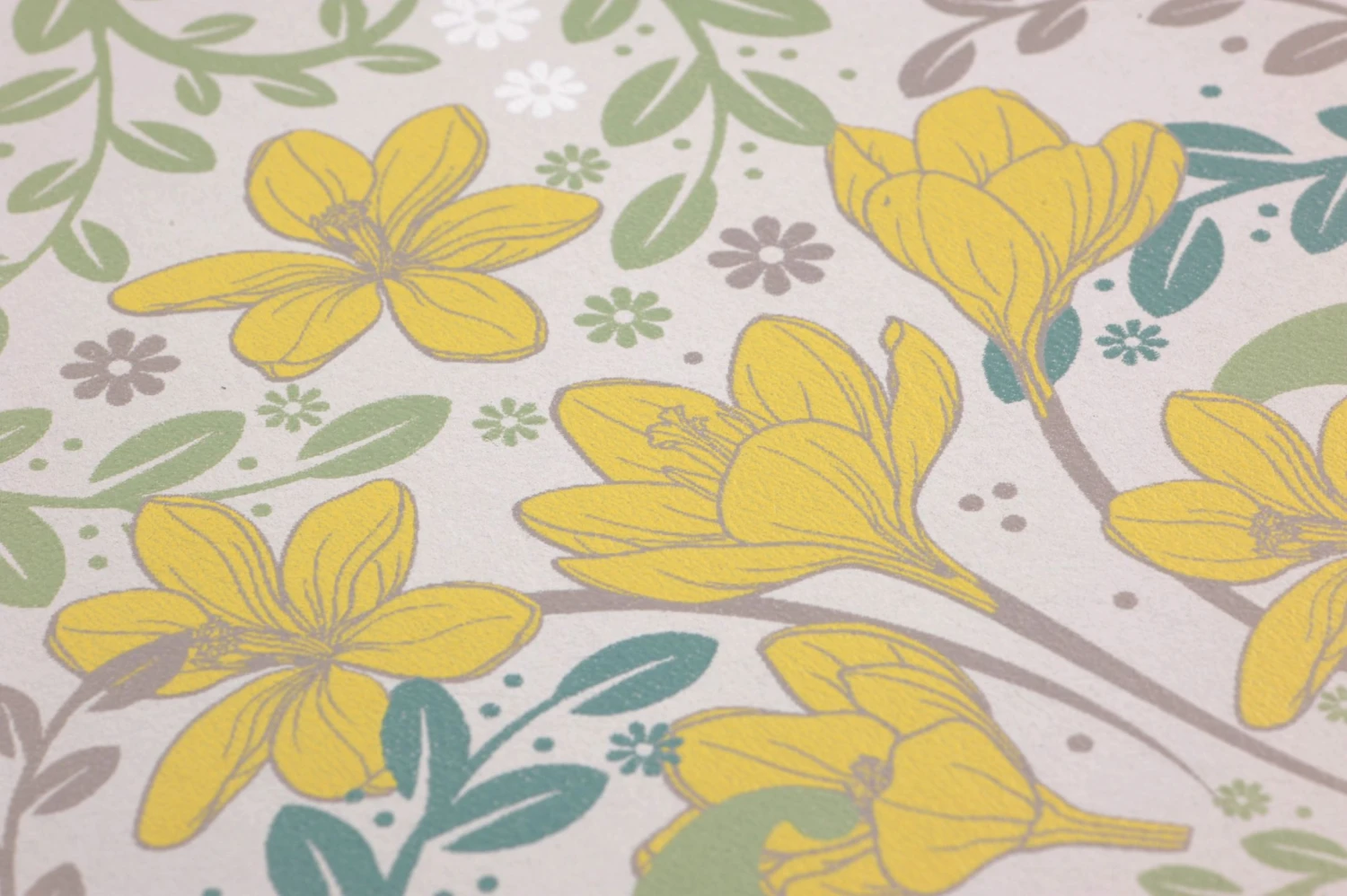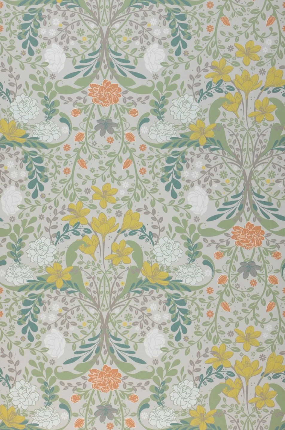 Die florale Tapete Kristina schlägt eine Brücke durch die Zeit. Farbgebung und Arrangement der hellen Blüten und Ranken auf dem grauweißen Grund sind an die englische Tradition des 19. Jahrhunderts angelehnt. Die Formen der Blätter und der kleinen Blumen im Hintergrund dagegen könnten ebenso aus Designs der 70er Jahre stammen. Zwischen den zweidimensional dargestellten Blüten und Blättern erhalten die größeren Tiefe und Gestalt durch fein gezeichnete Umrisse in Graubeige.