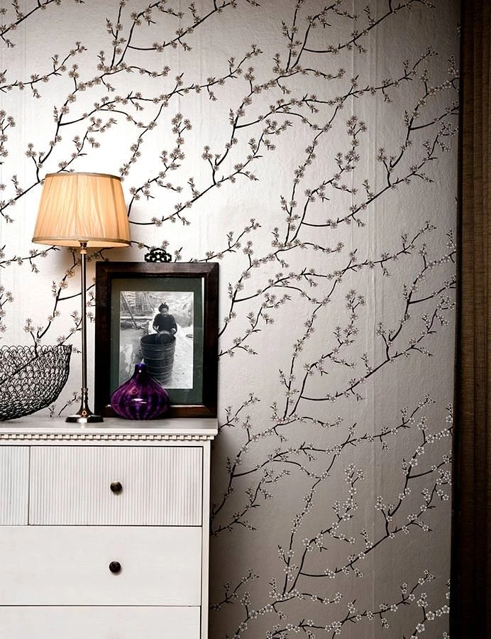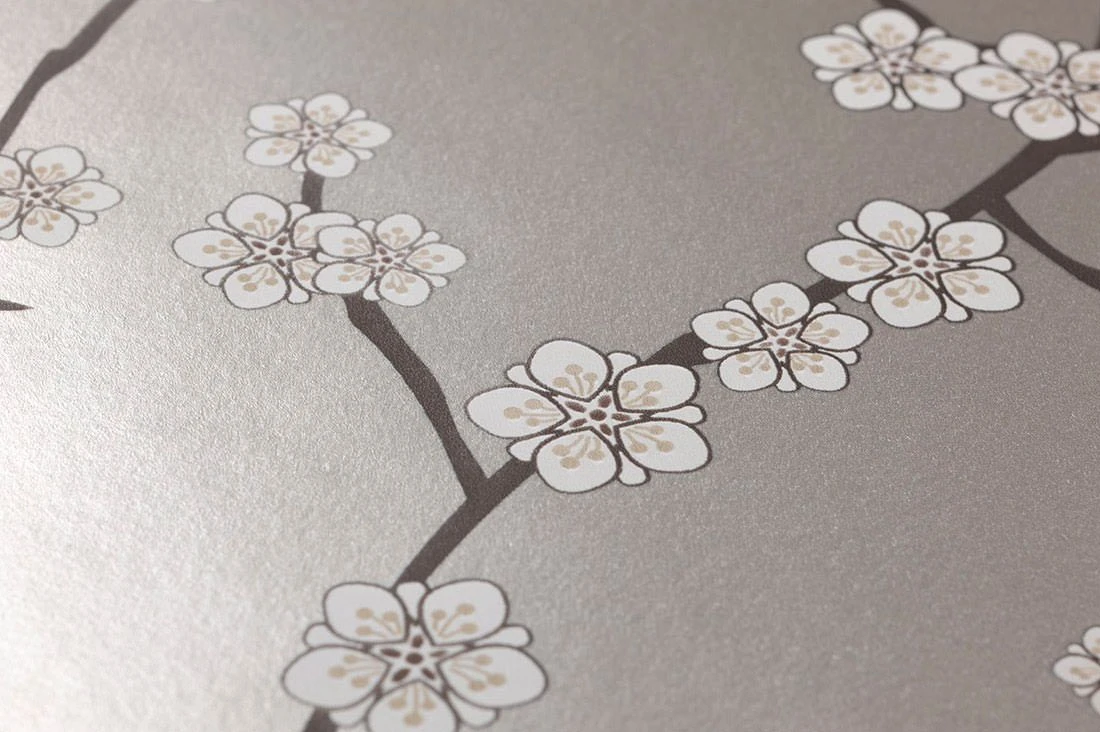 Diese glamouröse Tapete mit effektvollem Silbergrau-Schimmer und euphorisch wachsenden Kirschblütenzweigen wird Ihre Sinne verzaubern. Die florale Schönheit vereint natürliche Musterelemente mit luxuriösem Glanz. Entdecken Sie die nimmermüden Verzweigungen, die sich dem Licht entgegenstrecken und dabei einen diagonal verlaufenden Weg einschlagen. Die hochwertige abwaschbare Vliestapete bietet sich für Akzentwände oder die vollflächige Gestaltung gleichermaßen an.