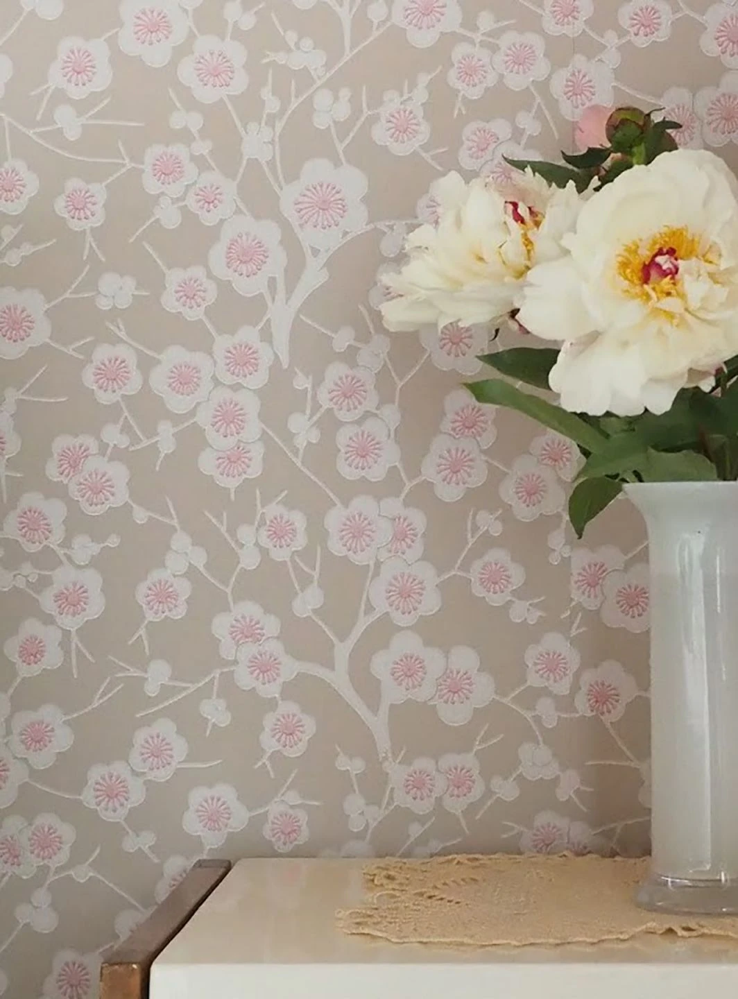 Die Kirschblüte, das japanische Symbol für Schönheit, ist auf dieser außergewöhnlichen Papiertapete im skandinavischen Stil umgesetzt. Das Design vereint die weißen Silhouetten von blütenbesetzten Kirschzweigen mit dem geschmackvollen graubeigen Grund und setzt hübsche Highlights in Form von rosafarbenen Staubgefäßen in jeder einzelnen Blüte. Das angewandte Leimdruckverfahren trägt zum hochwertigen, handgemachten Eindruck von Laila bei.
