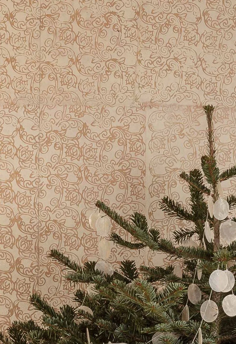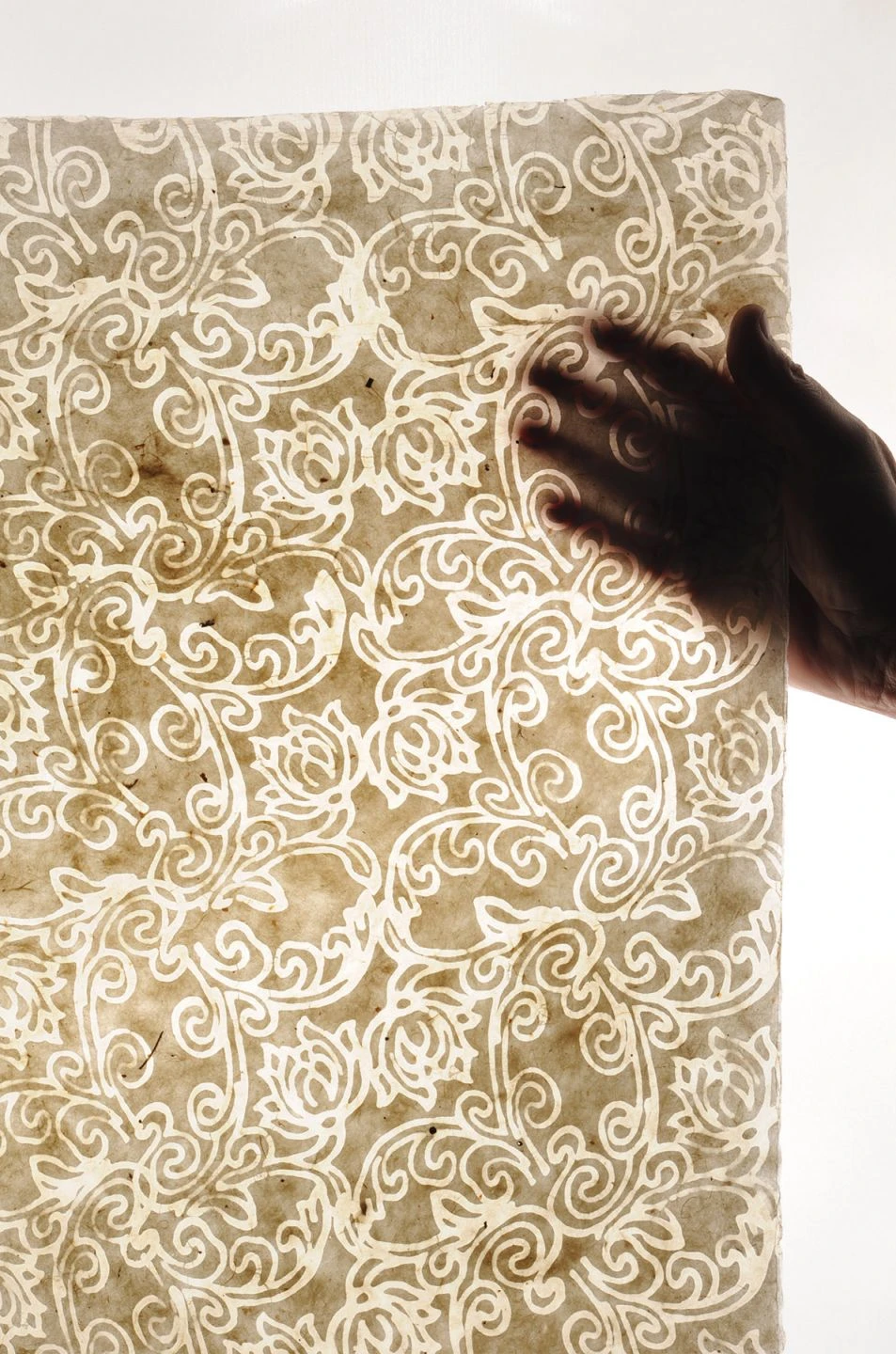 Abstrakte Blüten und Blattranken bilden das Muster im Ethno-Stil, das sich über die gewachste Papiertapete des französischen Herstellers Le Monde Sauvage zieht. Cremeweiß und Beige sind die aufeinander abgestimmten Farben, die sowohl mit hellen als auch mit dunklen Möbeln ausgezeichnet harmonieren. Jedes Blatt der ungewöhnlichen Tapete ist handgebatikt und ein echtes Unikat.