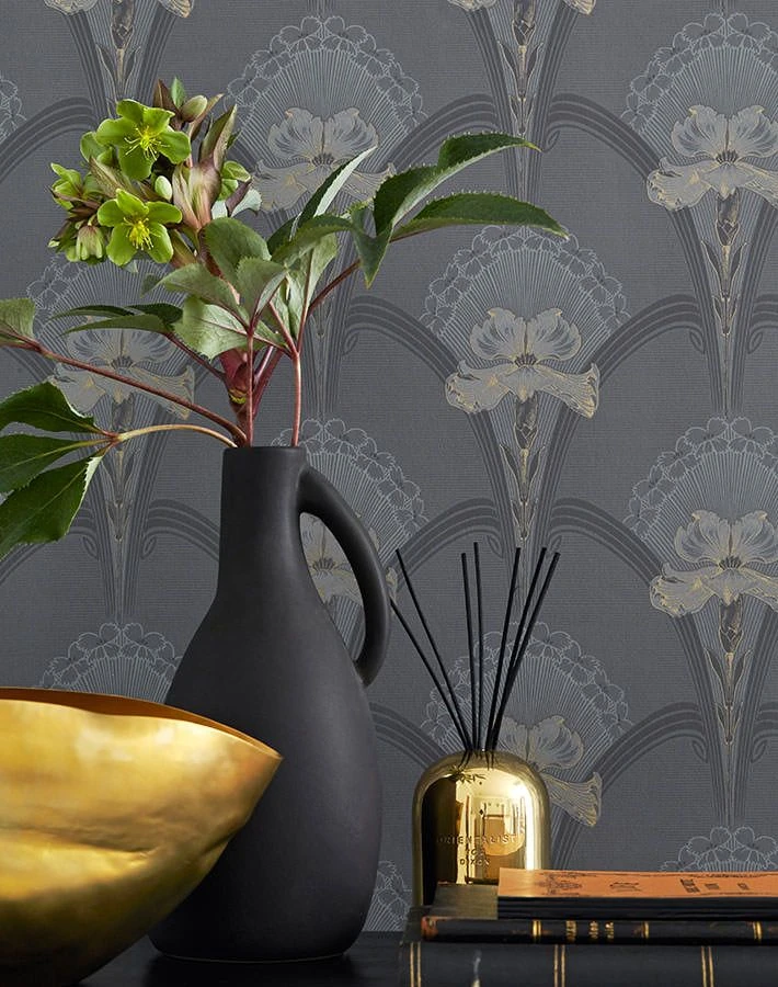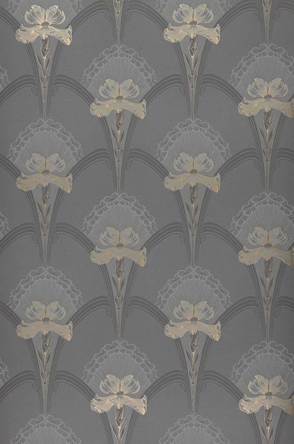 Geschwungene Bögen in der charakteristischen Ästhetik des Jugendstils bilden den Rahmen für üppig blühende Lilien. In dem ruhigen Grau des Untergrunds mit Ornamenten in Hell- und Dunkelgrau fallen die Lilien durch sparsam und wirkungsvoll eingesetzte Akzente aus leicht schimmerndem Perlgold besonders ins Auge. Aus der Entfernung entsteht ein klares, klassisch-symmetrisches Tapetenmuster, das zurückhaltende Ruhe mit einem Hauch von Luxus mischt.