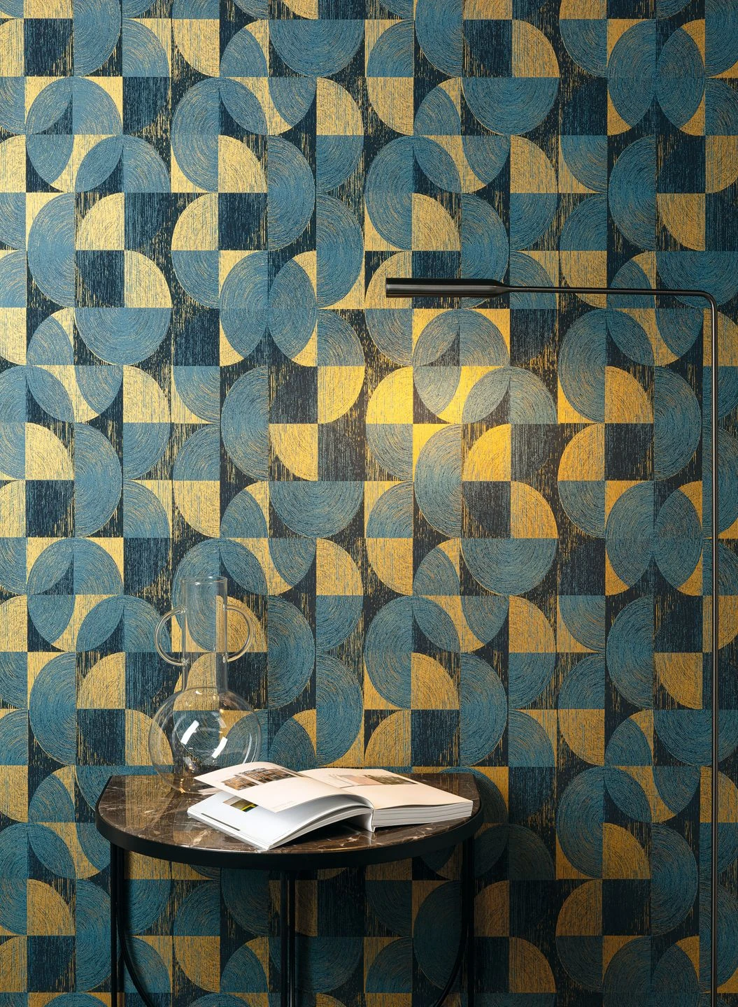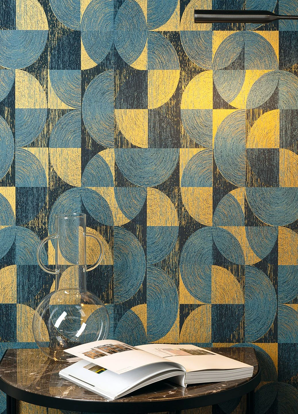 Dass geometrische Tapeten nicht statisch wirken müssen, zeigt Libertas eindrucksvoll. Eine spürbare Dynamik geht von ihrem Muster aus graphischen Elementen aus. Die Halb- und Viertelkreise, die das Muster beherrschen, wirken mit ihren Schraffuren in Stahlblau, Azurblau und Mattgold anregend und verströmen eine positive Energie. Das ausdrucksstarke Design beflügelt und belebt und lässt sich mit den passenden Farben ideal unterstreichen.