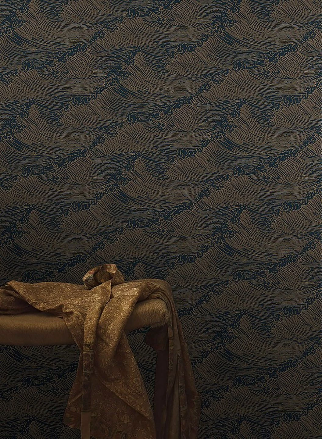 Wellen ganz aus goldenen und schwarzen Linien und Punkten auf dunklem Anthrazit erwecken den Eindruck des vom Wind bewegten Ozeans in der Dunkelheit der Nacht, in der nur das Licht des Mondes für Reflexe sorgt. Das Auf und Ab der Wellen, die wie ein Kupferstich wirken, erinnert an klassische asiatische Kunst und verleiht Ihrem Raum ein kostbares Angesicht. Der geschickte Einsatz von Licht – ob von Fenstern oder aus künstlichen Lichtquellen – erweckt die Goldfarbe der Wellen zum Leben.