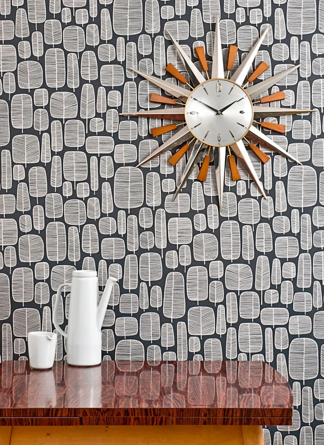 Das Große wiederholt sich im Kleinen – die Vliestapete illustriert diesen Satz auf besondere Weise. Die durch zarte Schraffur und einfache Umrisse angedeuteten Bäume mit ihren vielfältigen Formen könnten auch einzelne Blätter mit filigranen Blattadern und Rippen sein. Durch die weißen Schraffuren und Linien auf Anthrazitgrau mutet die außergewöhnliche Tapete wie ein Schwarzweiß-Negativ an.