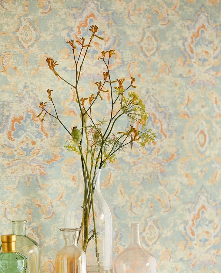 Sie lieben das Surrealistische, das Unfassbare, Kreationen, die zum Nachdenken anregen? Design Tapete Lompal in einer Farbkombination aus Pastellgrün, Azurblau, Beige, Minttürkis, Orange und Pastellviolett eröffnet die Welt der Fantasien. Ethno-Ornamente im indischen Stil mit Batikcharakter laden zum Erspüren ein und das im wahrsten Sinne des Wortes, denn die Vinyloberfläche weist eine textilähnliche Struktur auf.