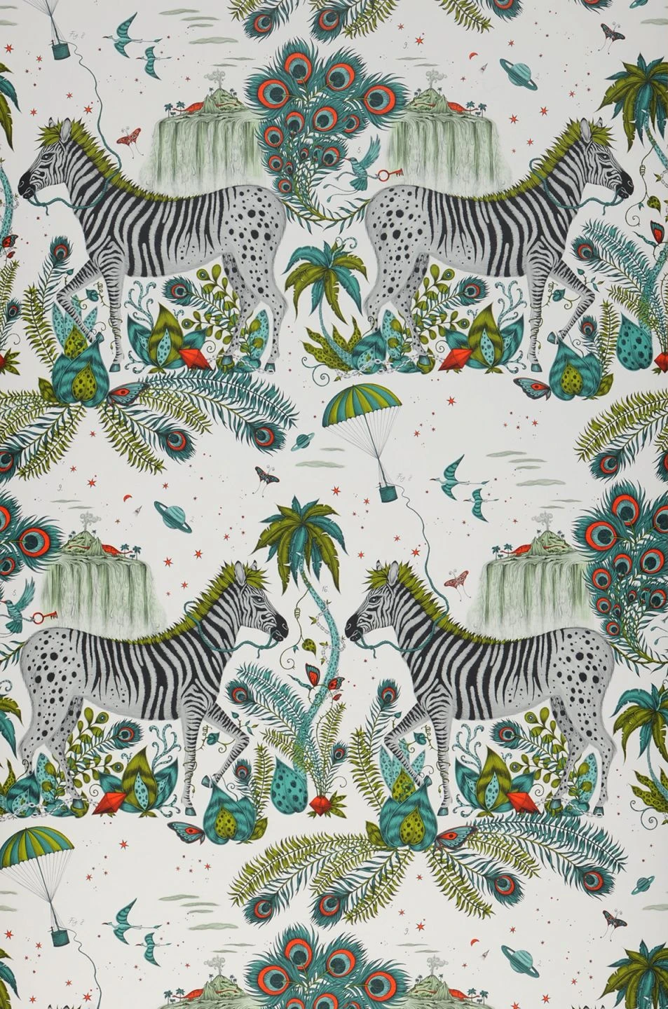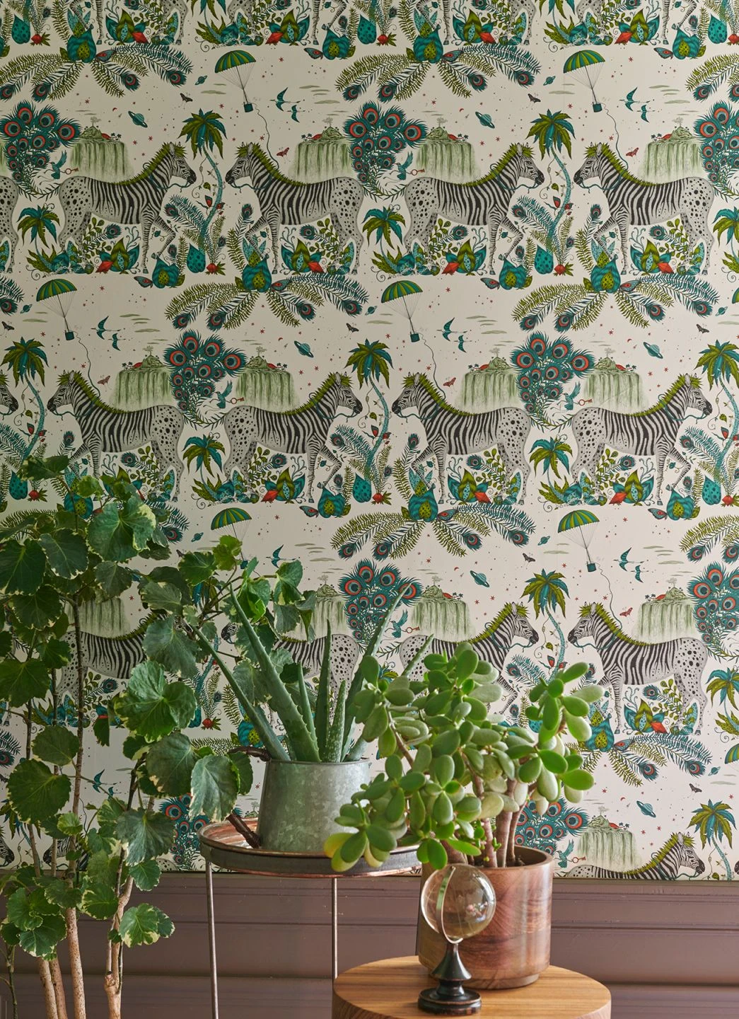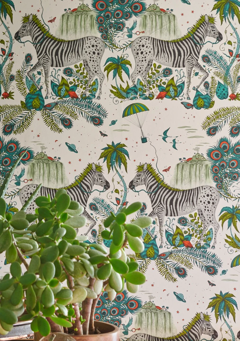 Diese phantasievolle Tapete macht jeden Raum, den Sie mit ihr schmücken, zu einem Erlebnis. Wie Bilder einer phantastischen Reise wirken ihre Motive: Zebras mit Flecken, grünen Mähnen und Schwänzen aus Pfauenfedern, exotische Pflanzen, im Hintergrund eine Hochebene mit Sauriern, dazwischen Sterne, Planeten und Vögel. Der bunte Wandschmuck regt die Phantasie an und lässt Sie den Alltag vergessen. (Figari)