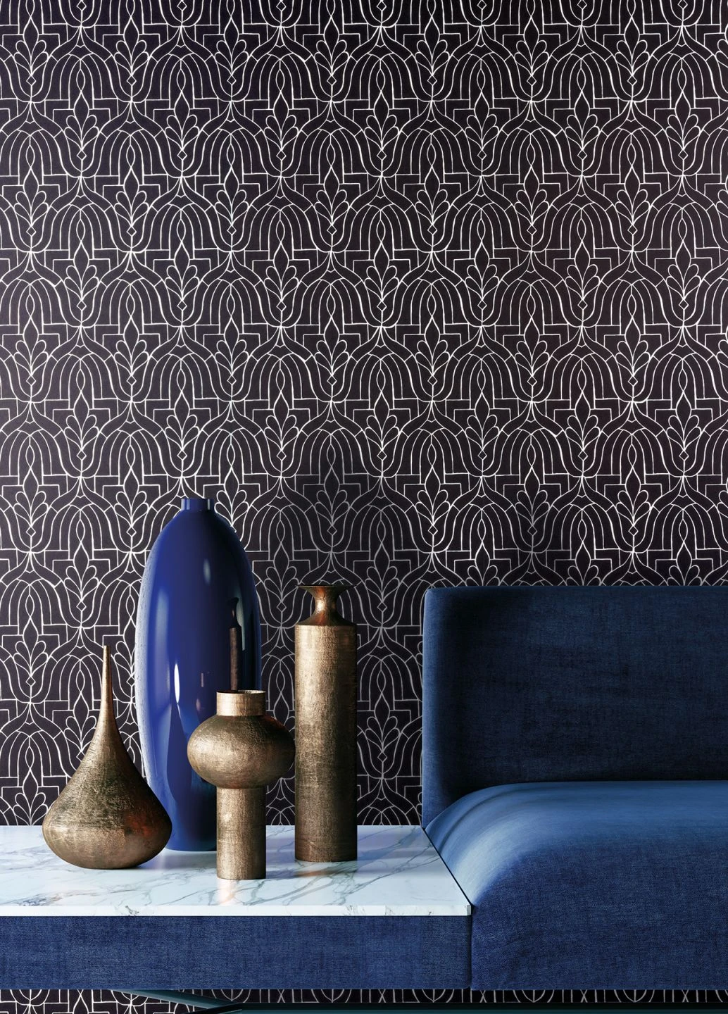 Nur angedeutet durch fühlbare weiße Linien auf dem schwarzen Untergrund dieser Vliestapete, entstehen orientalische Ornamente. Der Verlauf der Linien, ob parallel oder aufeinander zu, in geschwungenen Bögen oder als gerade Strecken, scheint die Kuppeln märchenhafter Gebäude, stilisierte Bäume oder Fächer aus Pfauenfedern zu bilden. Durch den unterschiedlich starken Farbauftrag der leicht erhabenen weißen Musterfarbe wirkt die Tapete wie ein kostbares handgearbeitetes Unikat.