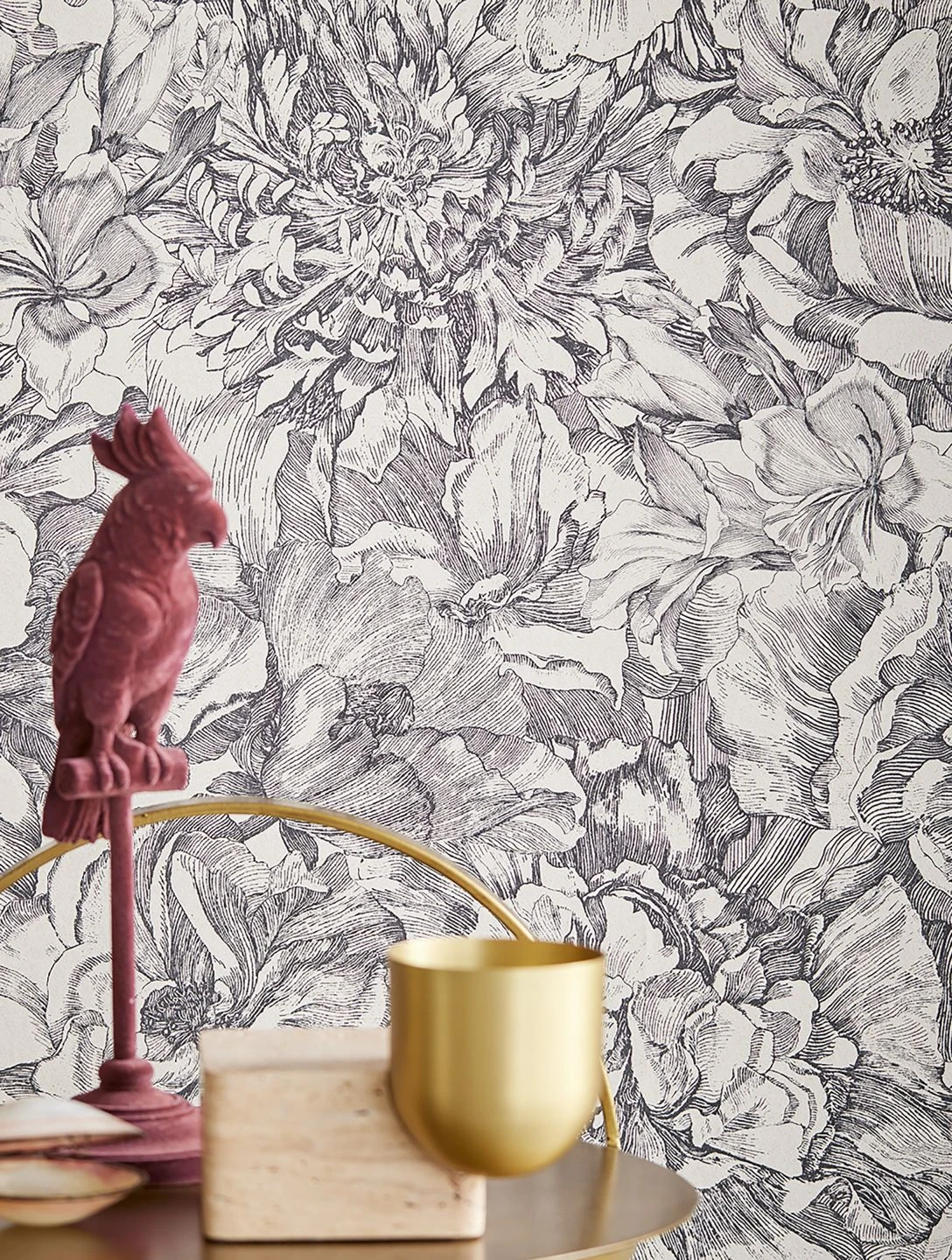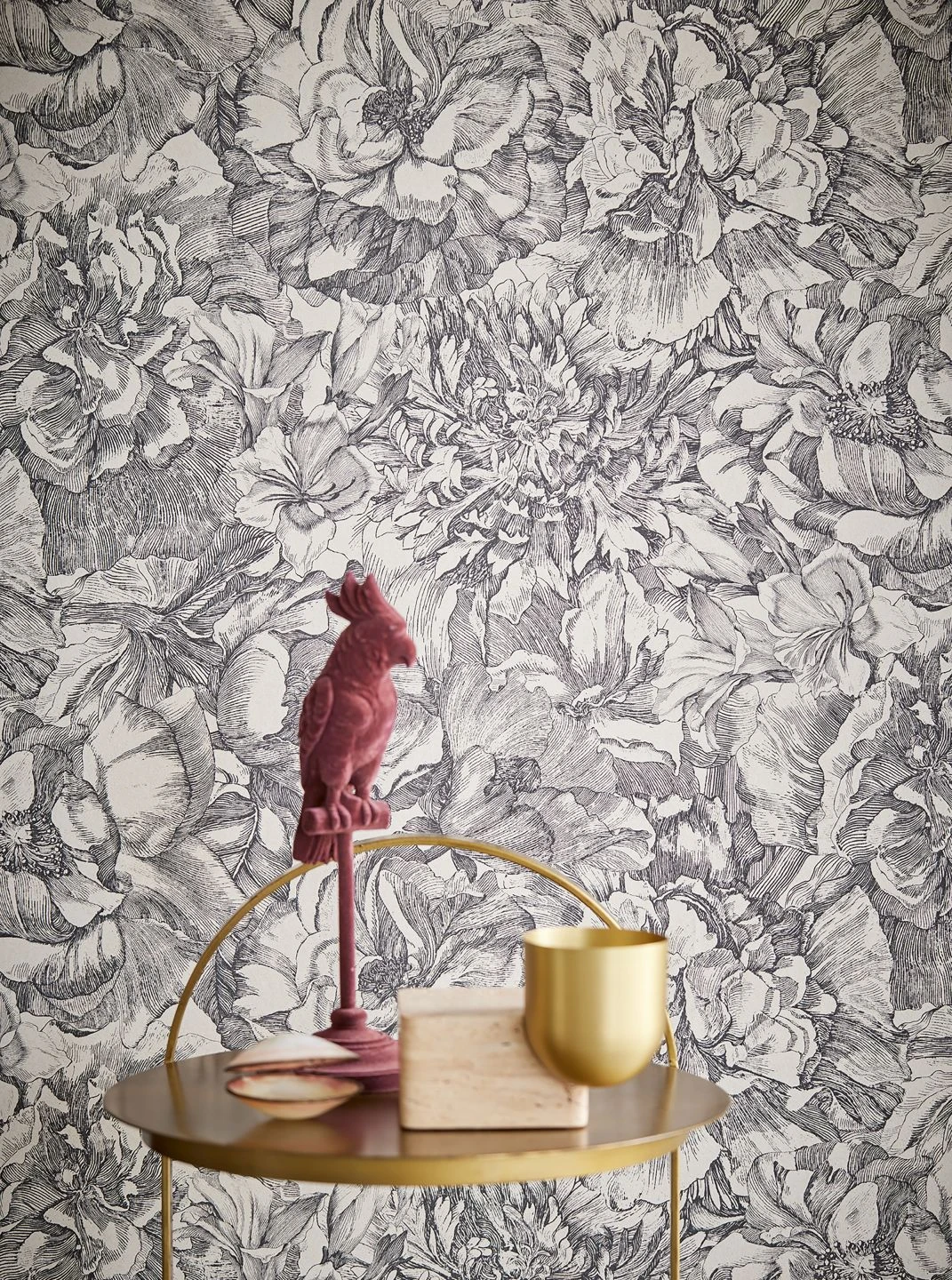 Ein faszinierendes Gesamtbild bilden die großen, ausladenden Blüten, die sich aus feinen Linien und Schraffuren in Basaltgrau zusammensetzen. So entsteht die Anmutung eines historischen Kupferstichs. Die phantastischen Formen, wie in Nahaufnahme dargestellt, geben Ihrem Raum einen bewegten Charakter, indem sie die glatte Wand aufzulösen scheinen. Louise lässt sich mit jeder gewünschten Farbe kombinieren, bietet aber auch einen wirkungsvollen Hintergrund für schwarze oder weiße Möbel.